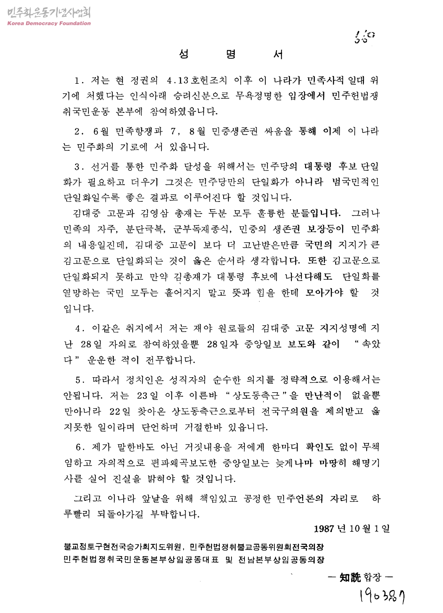 성명서[중앙일보의 왜곡보도를 해명하고 공정한 민주언론이기를 요구]