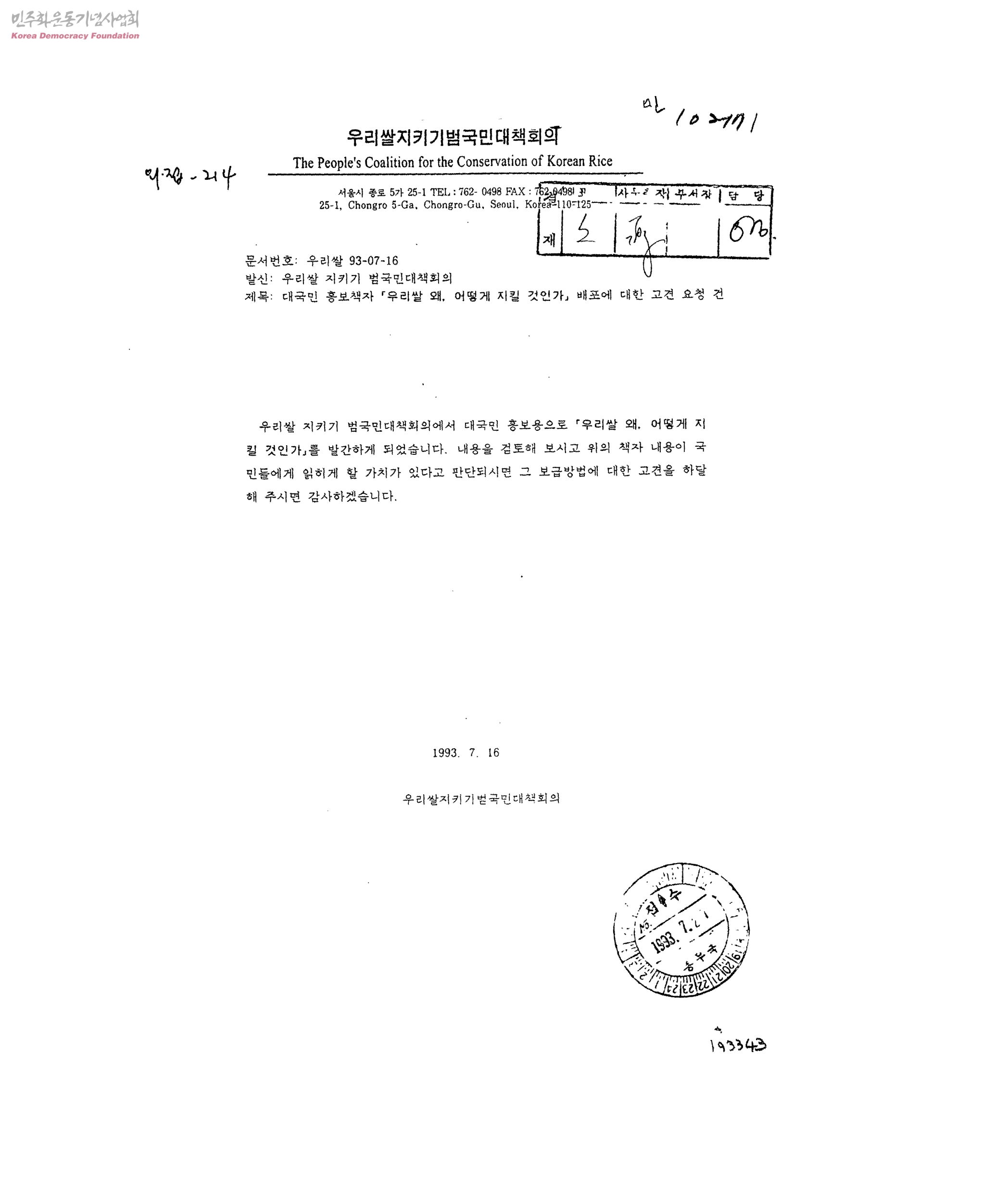 대국민 홍보책자 「우리쌀 왜, 어떻게 지킬 것인가 」배포에 대한 고견 요청 건