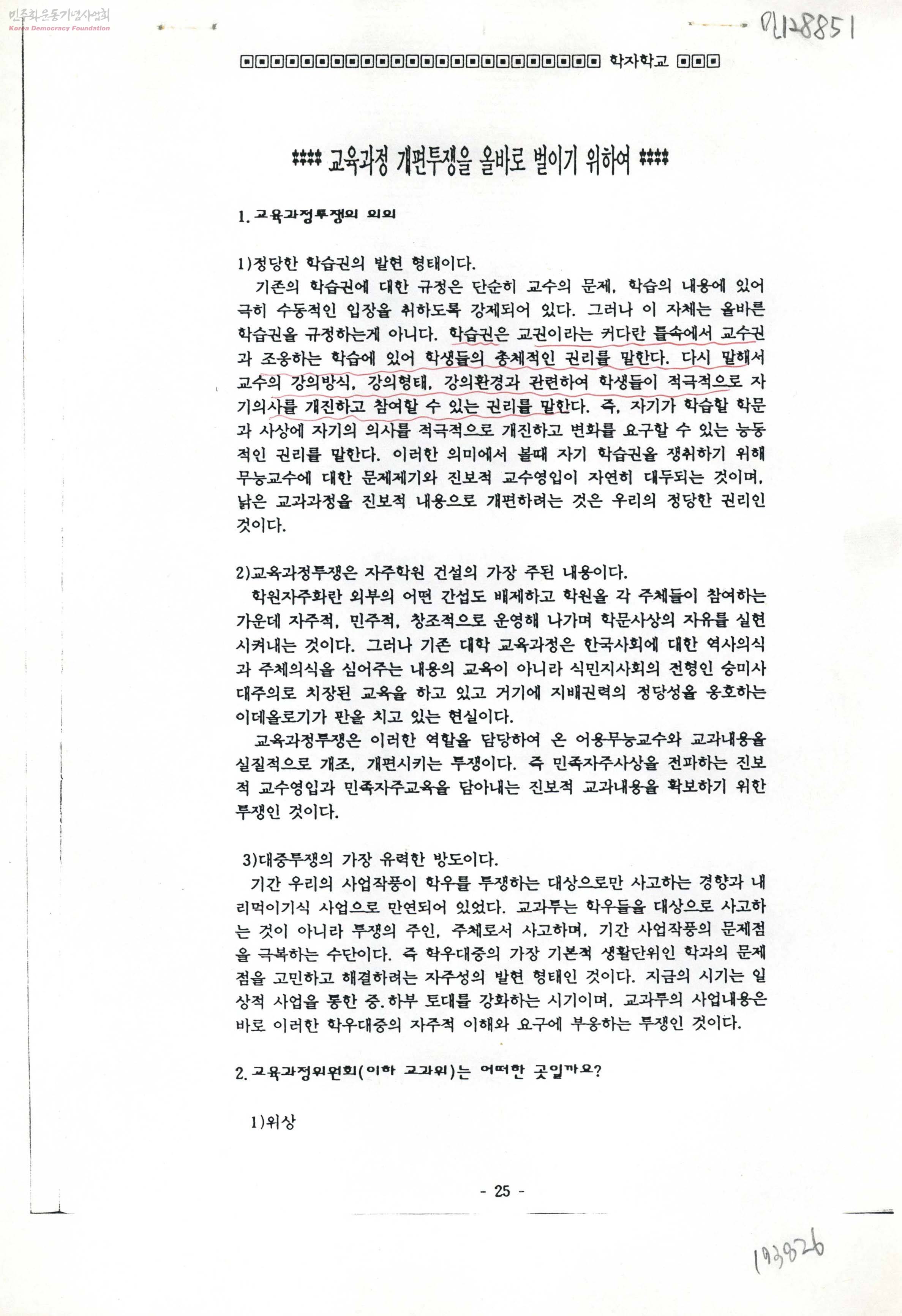 - 올바른 대학 교육과정 (개편)투쟁을 위한 평가 및 제언 등의 내용
