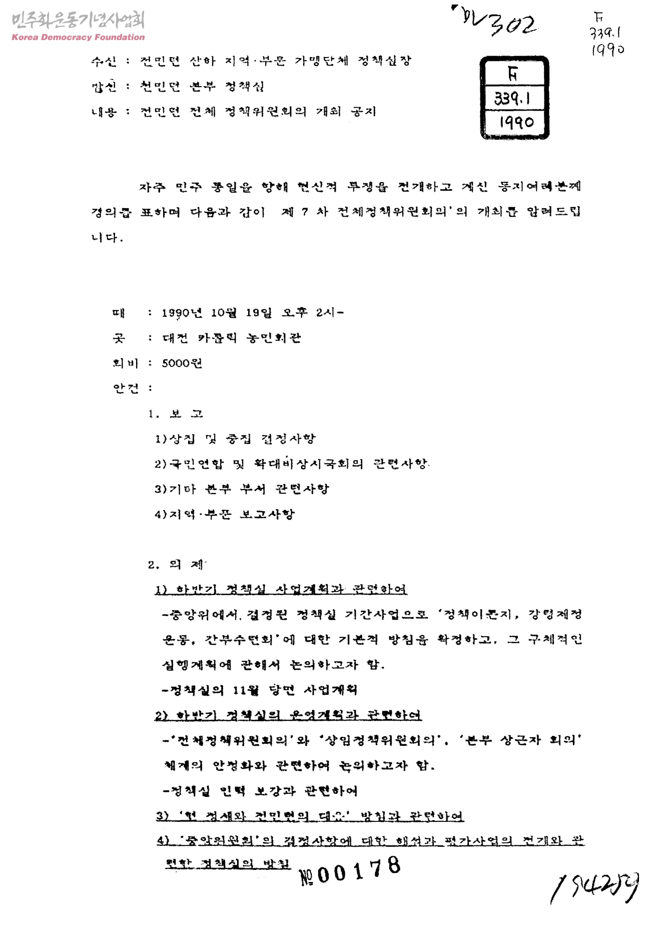 전민련 전체 정책위원회의 개최 공지[수신:전민련 산하 지역.부문 가맹단체 정책실장, 발신:전민련 본부 정책실]