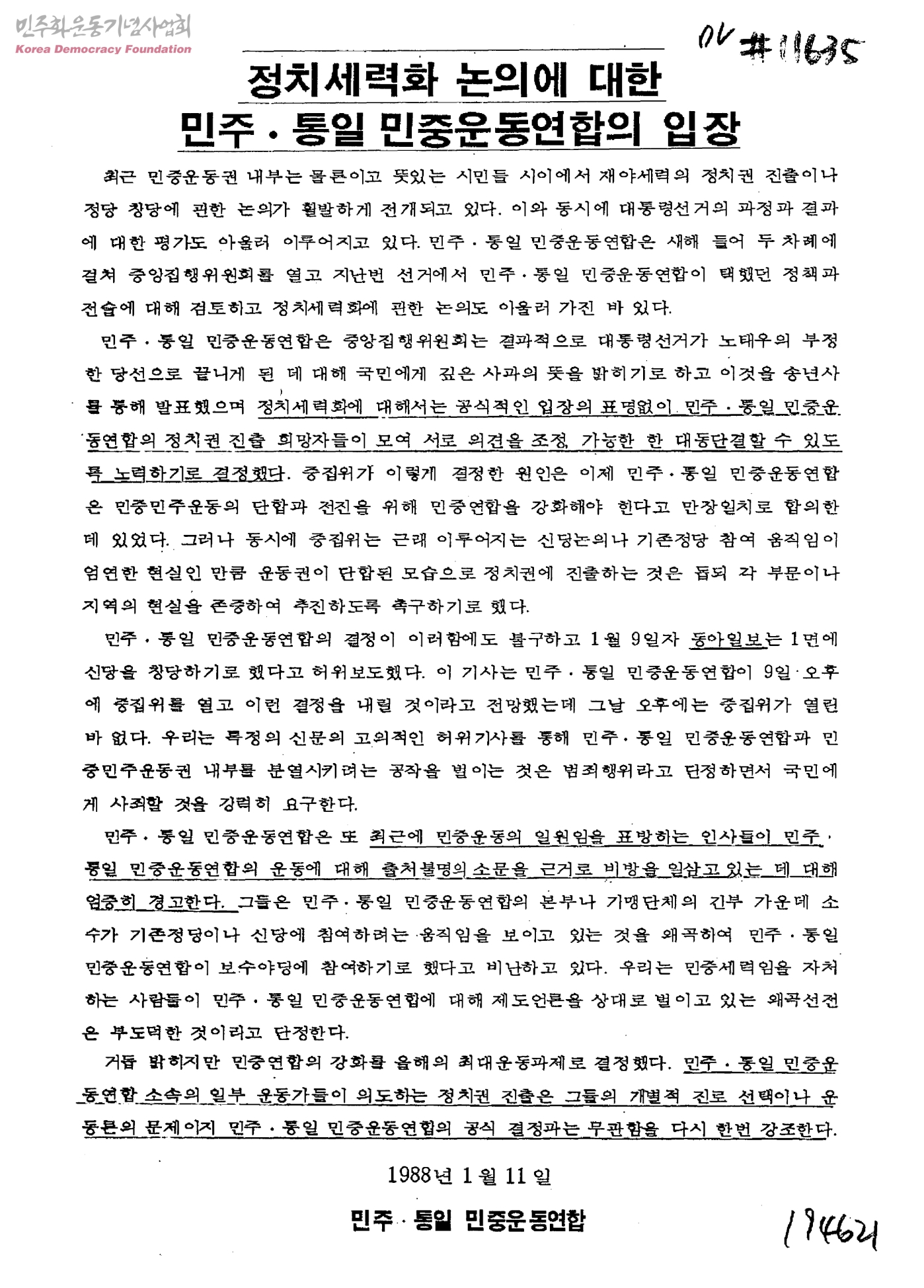 정치세력화 논의에 대한 민주ㆍ통일민중운동연합의 입장