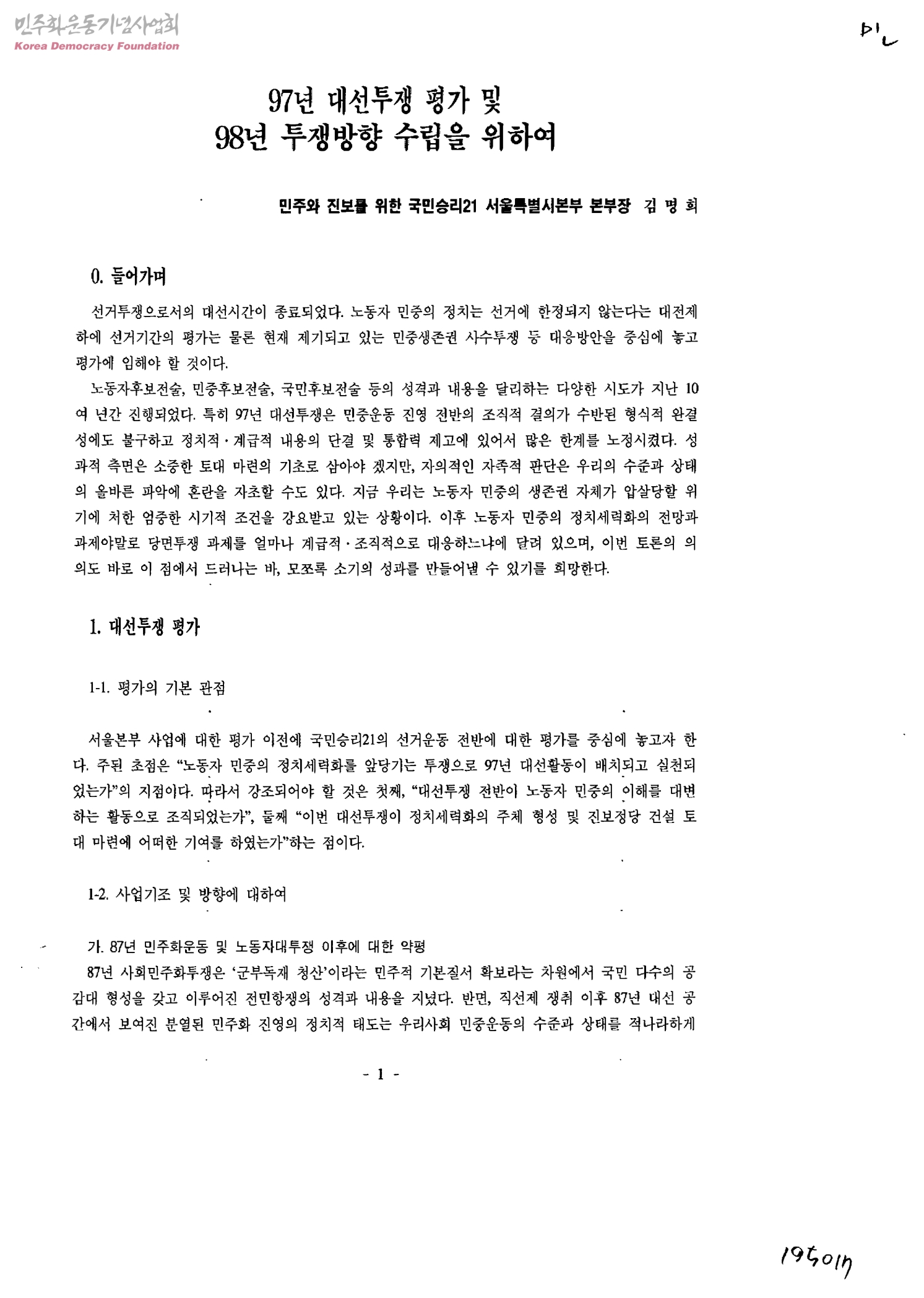 97년 대선투쟁 평가 및 98년 투쟁방향 수립을 위하여