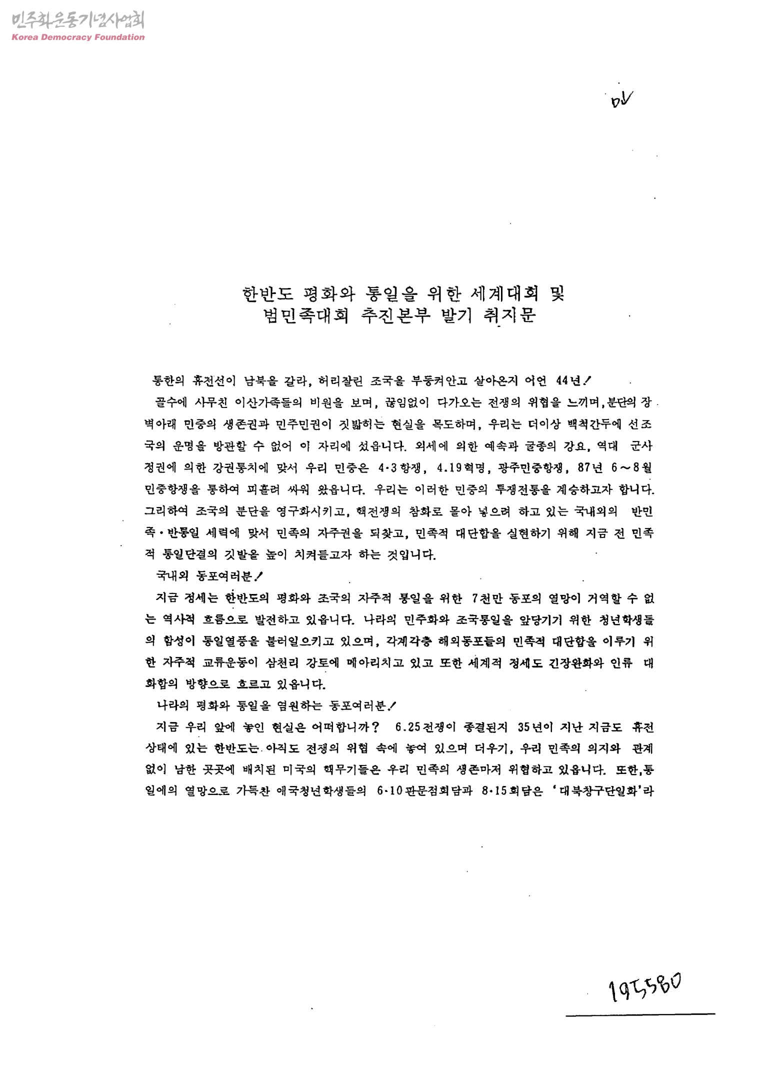 한반도 평화와 통일을 위한 세계대회 및 범민족대회 추진본부 발기 취지문