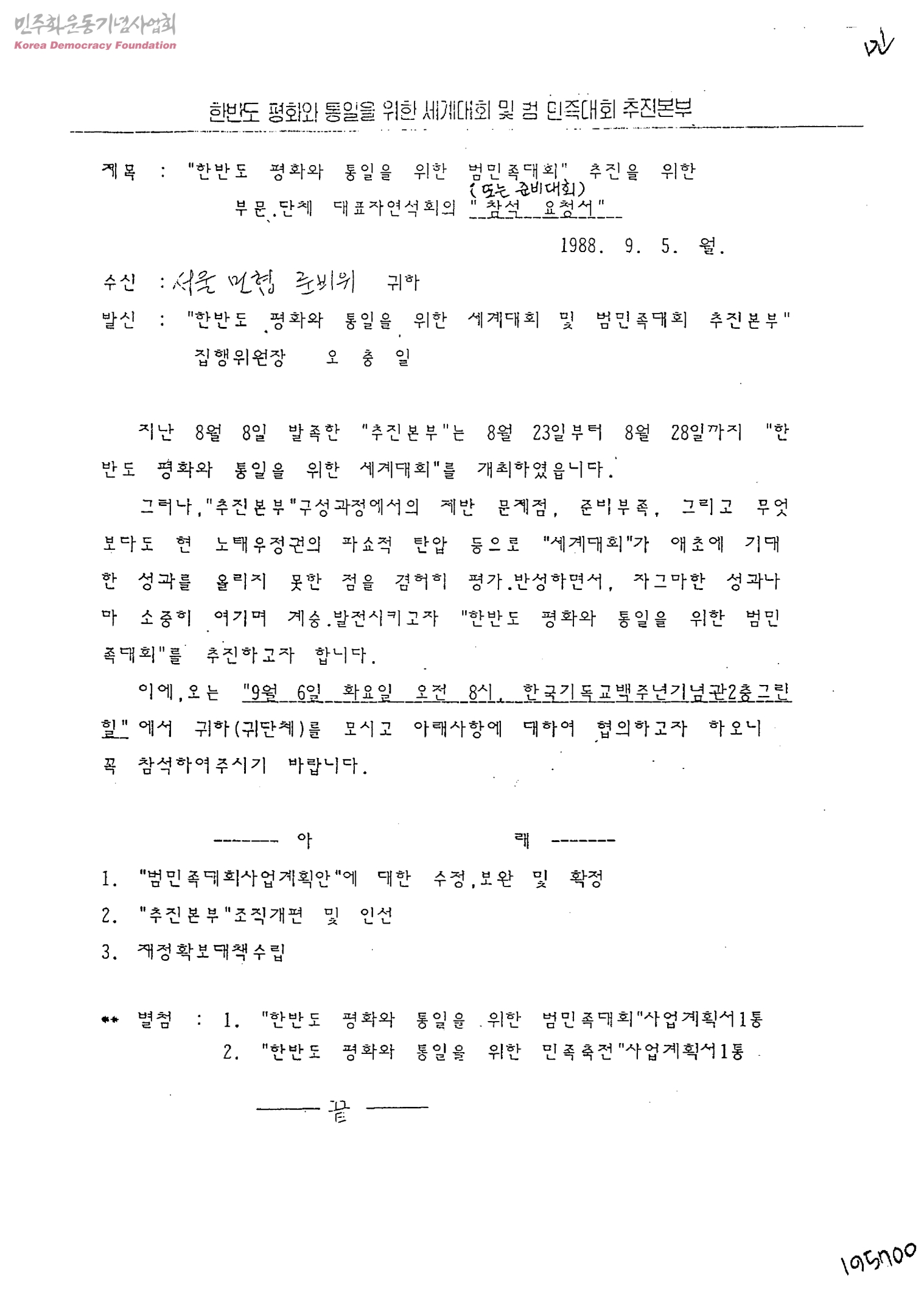 한반도 평화와 통일을 위한 범민족대회(또는 준비대회) 추진을 위한 부문, 단체 대표자연석회의 참석 요청서[수신:서울 민협 준비위원회, 발신:한반도평화와통일을위한세계대회및범민족대회추진본부 집행위원장 오충일]