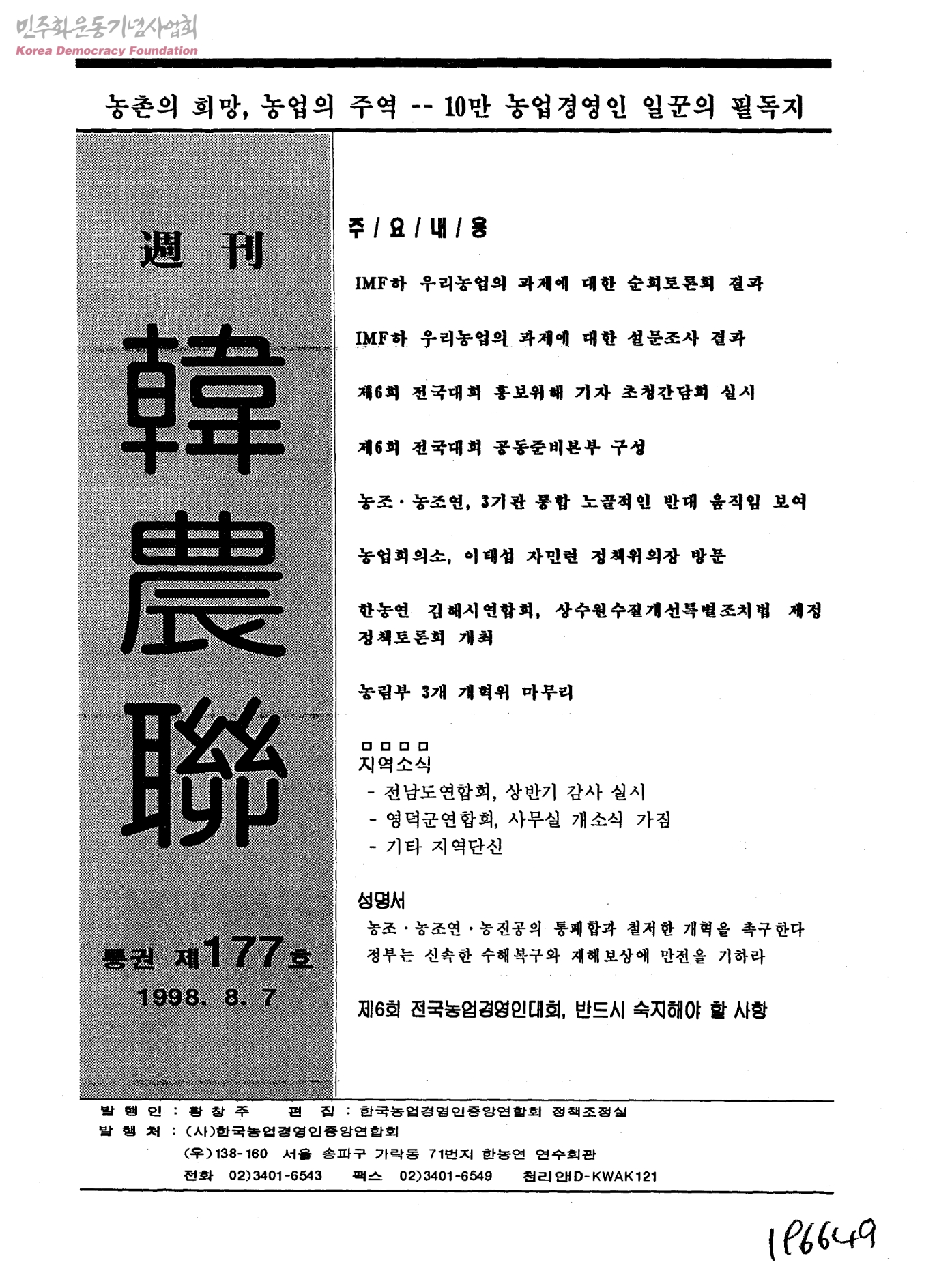 - 1.IMF하 우리농업의 과제에 대한 순회토론회 결과 2.IMF하 우리농업의 과제에 대한 설문조사 결과 3.제6회 전국대회 홍보위해 기자 초청간담회 실시 4.제6회 전국대회 공동준비본부 구성 5.농조·농조연, 3기관 통합 노골적인 반대 움직임 보여 6.농업회의소, 이태섭 자민련 정책위의장 방문 7.한농연 김해시연합회, 상수원수질개선특별조치법 제정 정책토론회 개최 8.농림부 3개 개혁위 마무리 9.지역소식 10.성명서 11.제6회 전국농업경영인대회, 반드시 숙지해야 할 사항