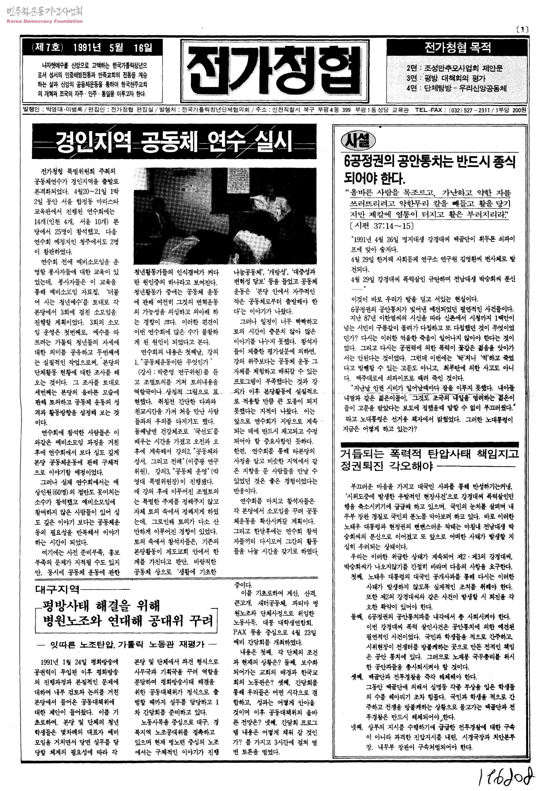 - 1.경인지역 공동체 연수 실시 2.사설-6공정권의 공안통치는 반드시 종식되어야 한다 3.기획연재:청년사목의 현실(6)-안동지역을 중심으로 4.평방사태의 의미와 과제 5.단체탐방-자주신앙 공동체를 지향하는 천주교, 우리신앙 공동체