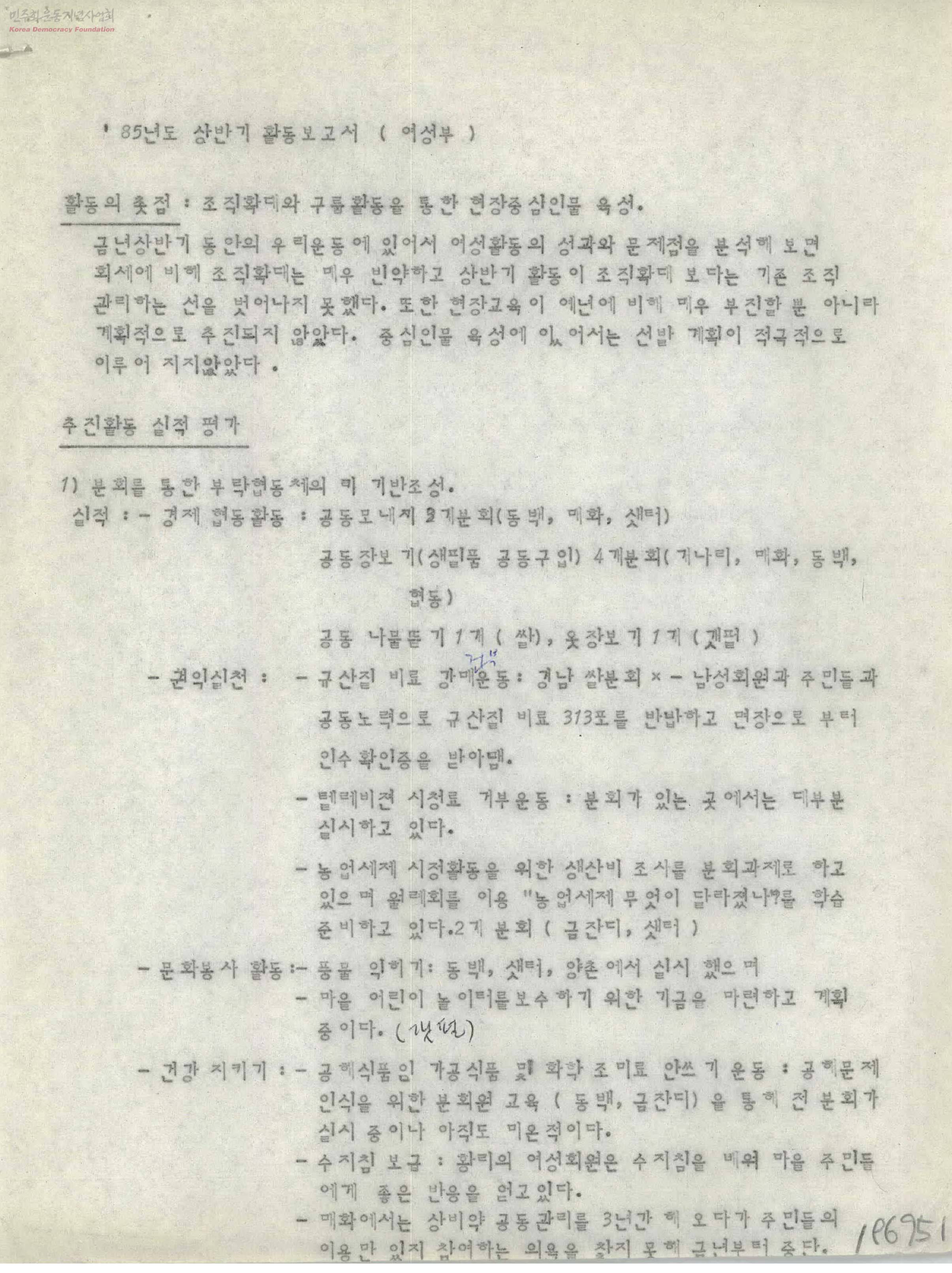 - '활동의 초점: 조직확대와 그룹학습을 통한 현장 중심인물 육성'에 대한 총평과 추진활동의 실적, 기본업무의 사항 등을 정리하고 평가를 진행하고 있음.