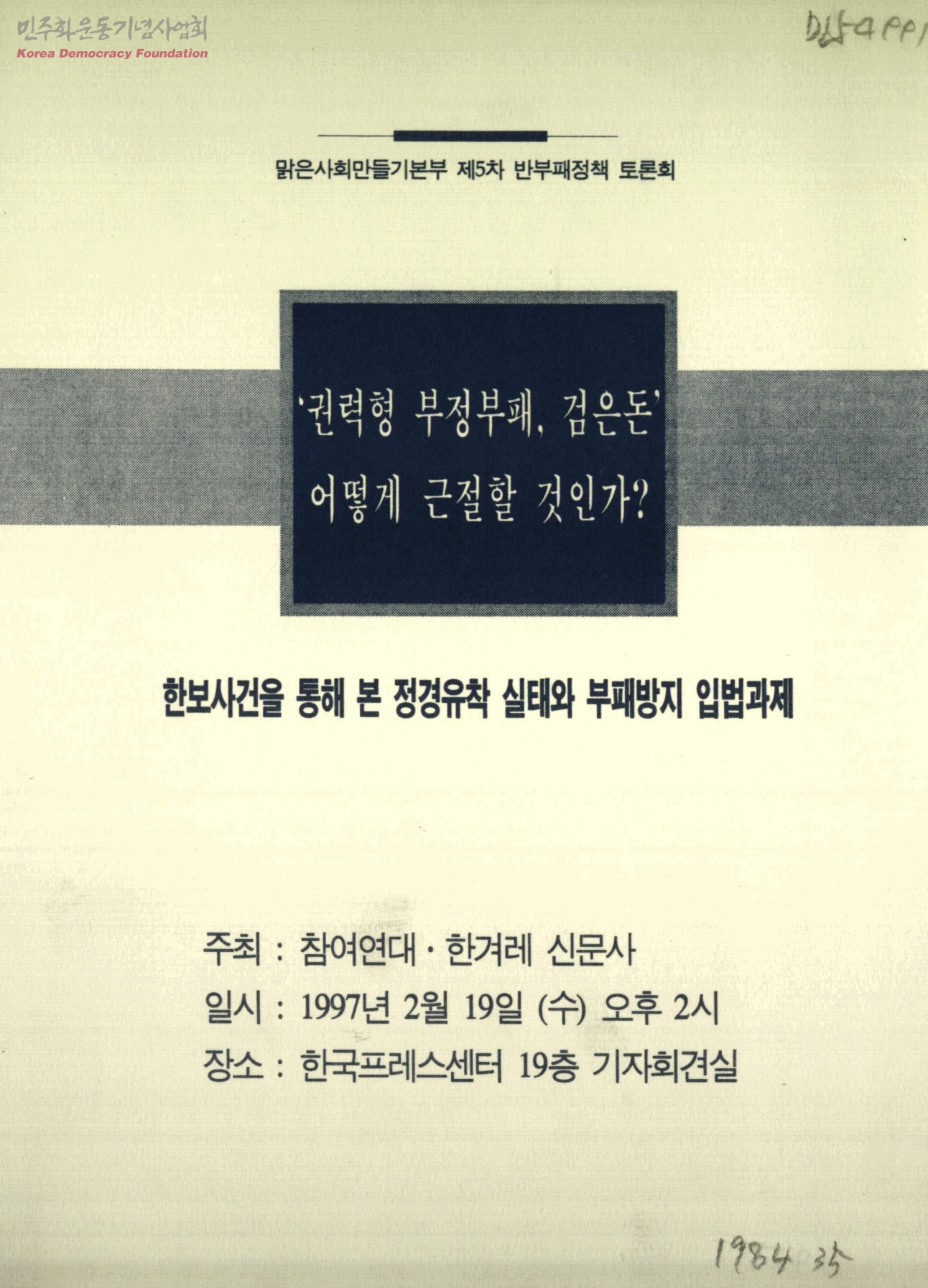맑은사회만들기본부 제5차 반부패정책 토론회 '권력형 부정부패, 검은돈' 어떻게 근절할 것인가? - 한보사건을 통해 본 정경유착 실태와 부패방지 입법과제
