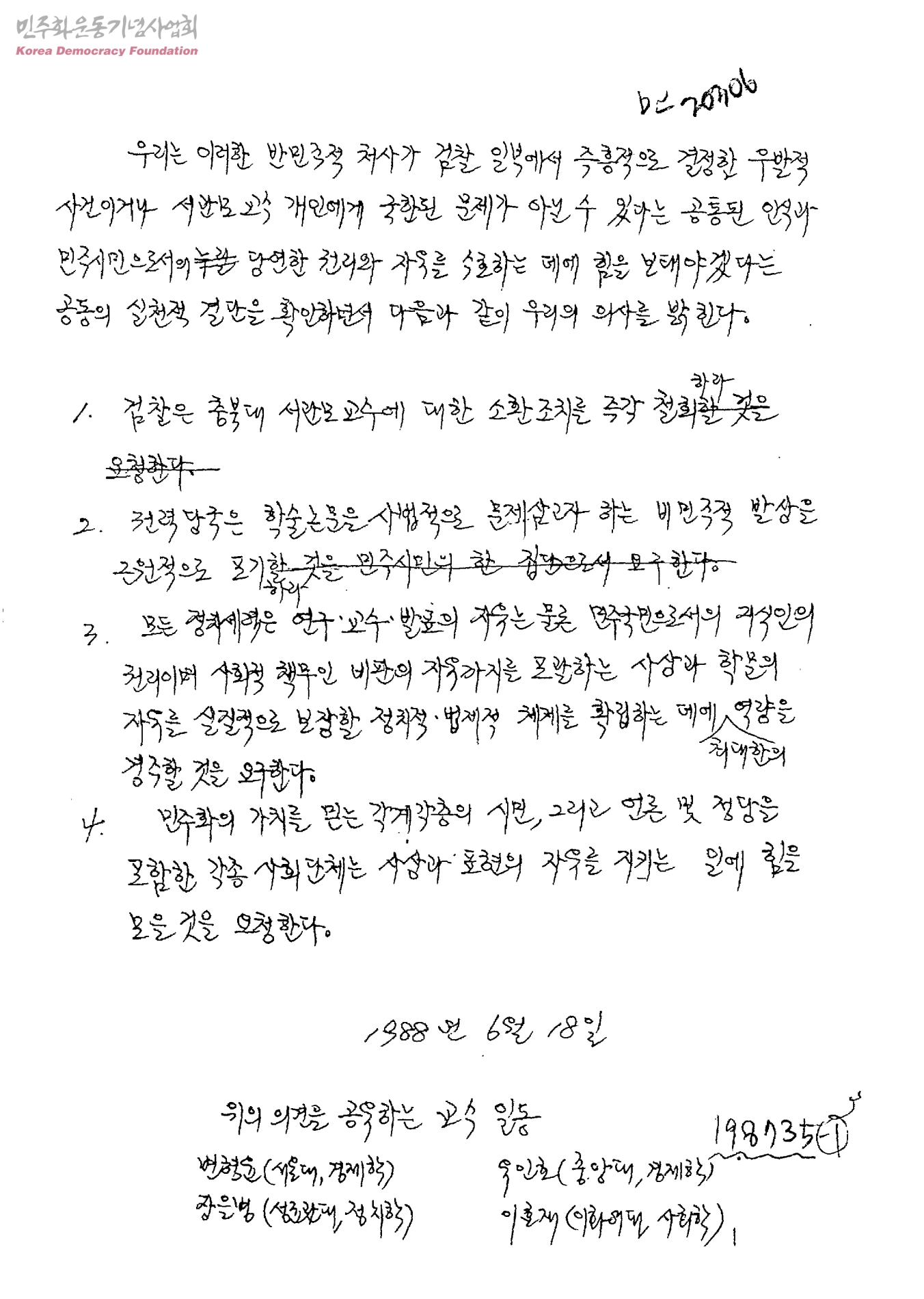 - 변형윤(서울대경제학교수)/유인호(중앙대경제학교수)/장을병(성균관대정치학교수)/이효재(이화여대사회학교수)