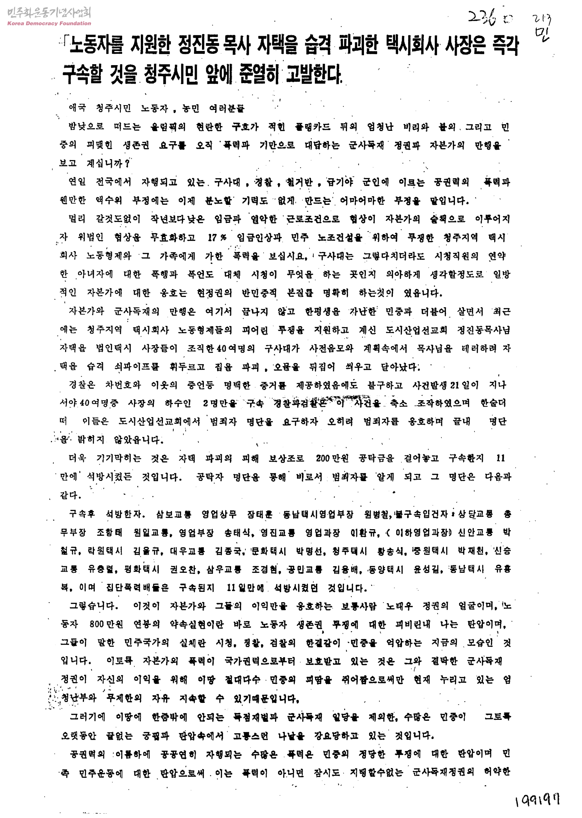 노동자를 지원한 정진동 목사 자택을 습격 파괴한 택시회사 사장은 즉각 구속할 것을 청주시민 앞에 준열히 고발한다.