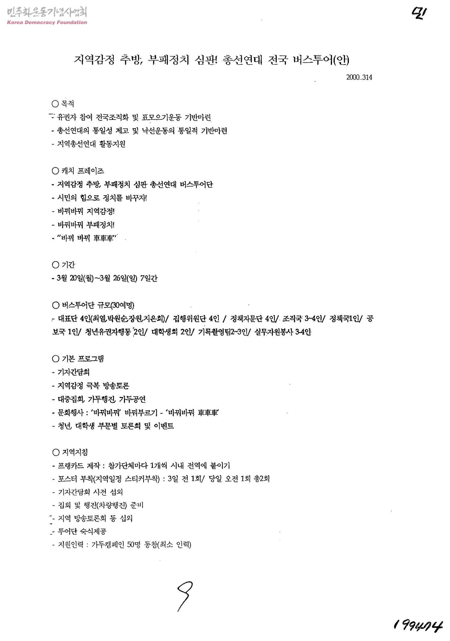 지역감정 추방, 부패정치 심판! 총선연대 전국 버스투어(안)