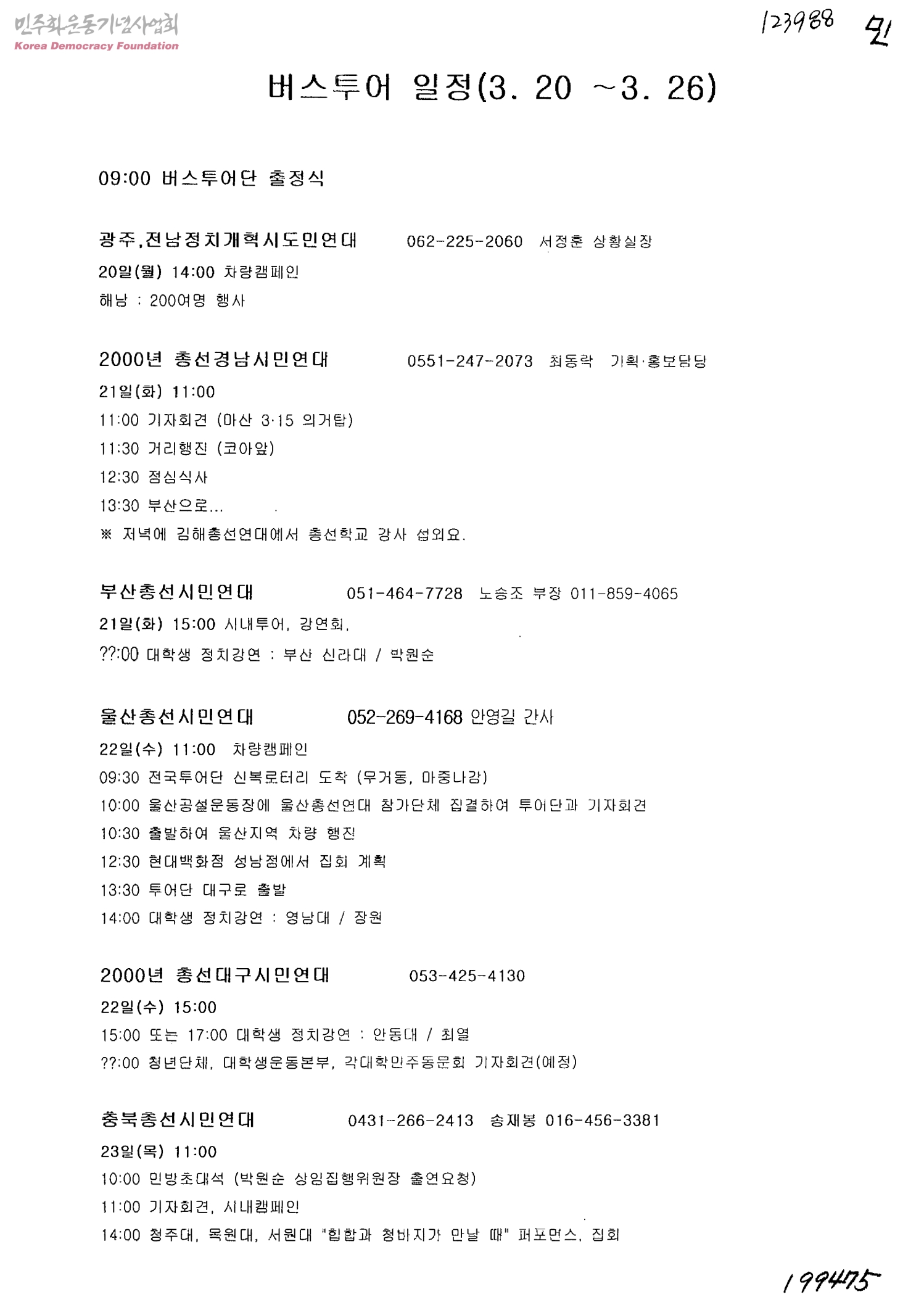 총선연대 버스투어 일정(3.20~3.26)