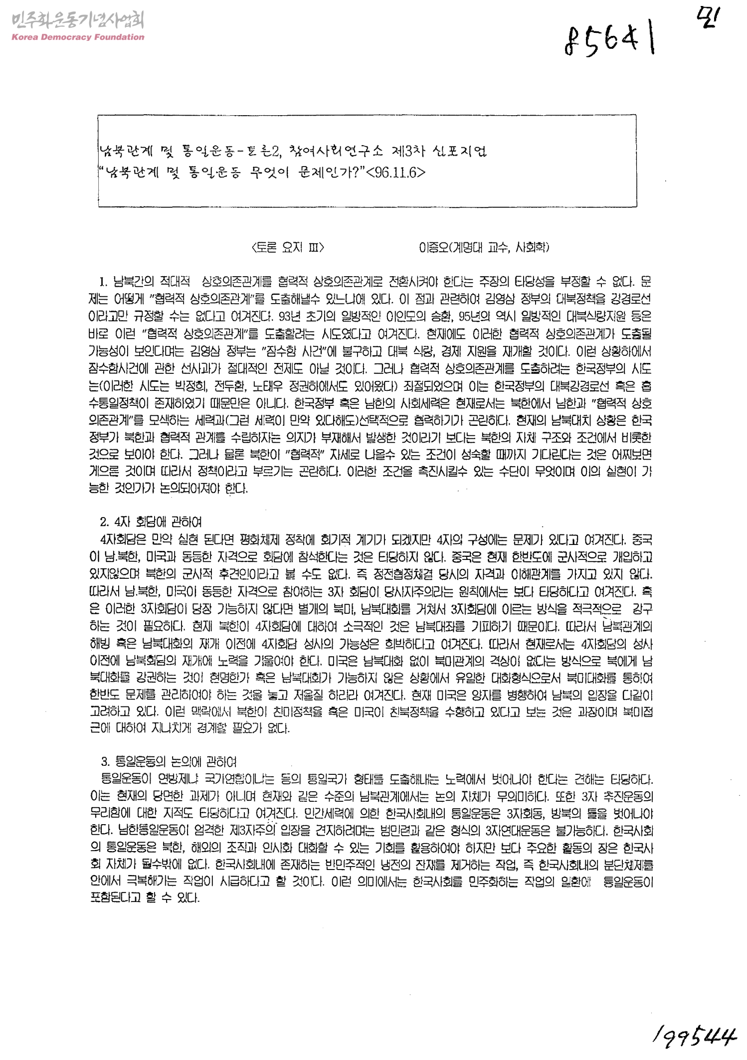 참여사회연구소 제3차 심포지엄-남북관계 및 통일운동 무엇이 문제인가?