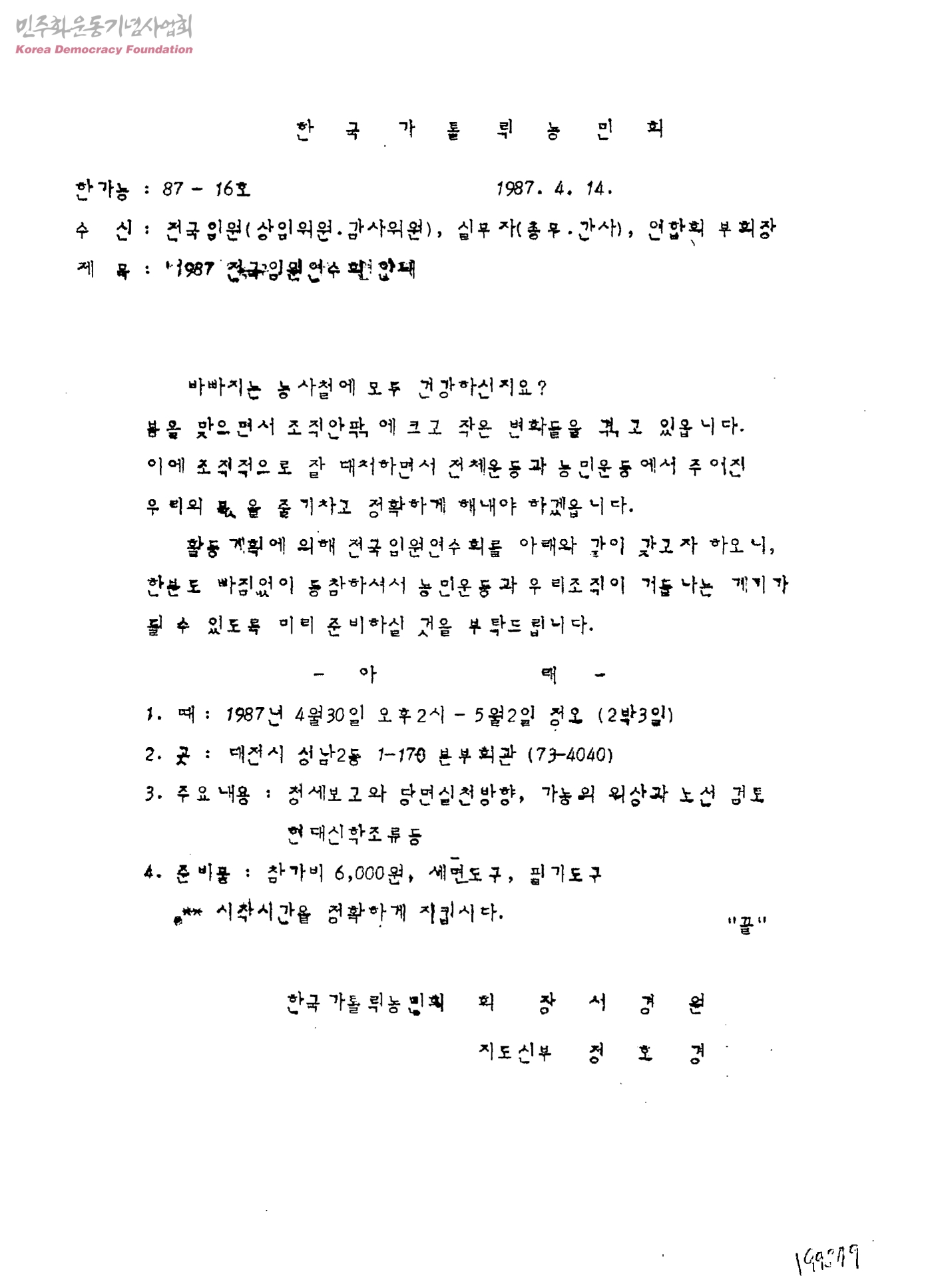 1987 전국임원연수회 안내[수신:전국임원·실무자·부회장,발신:한국가톨릭농민회]