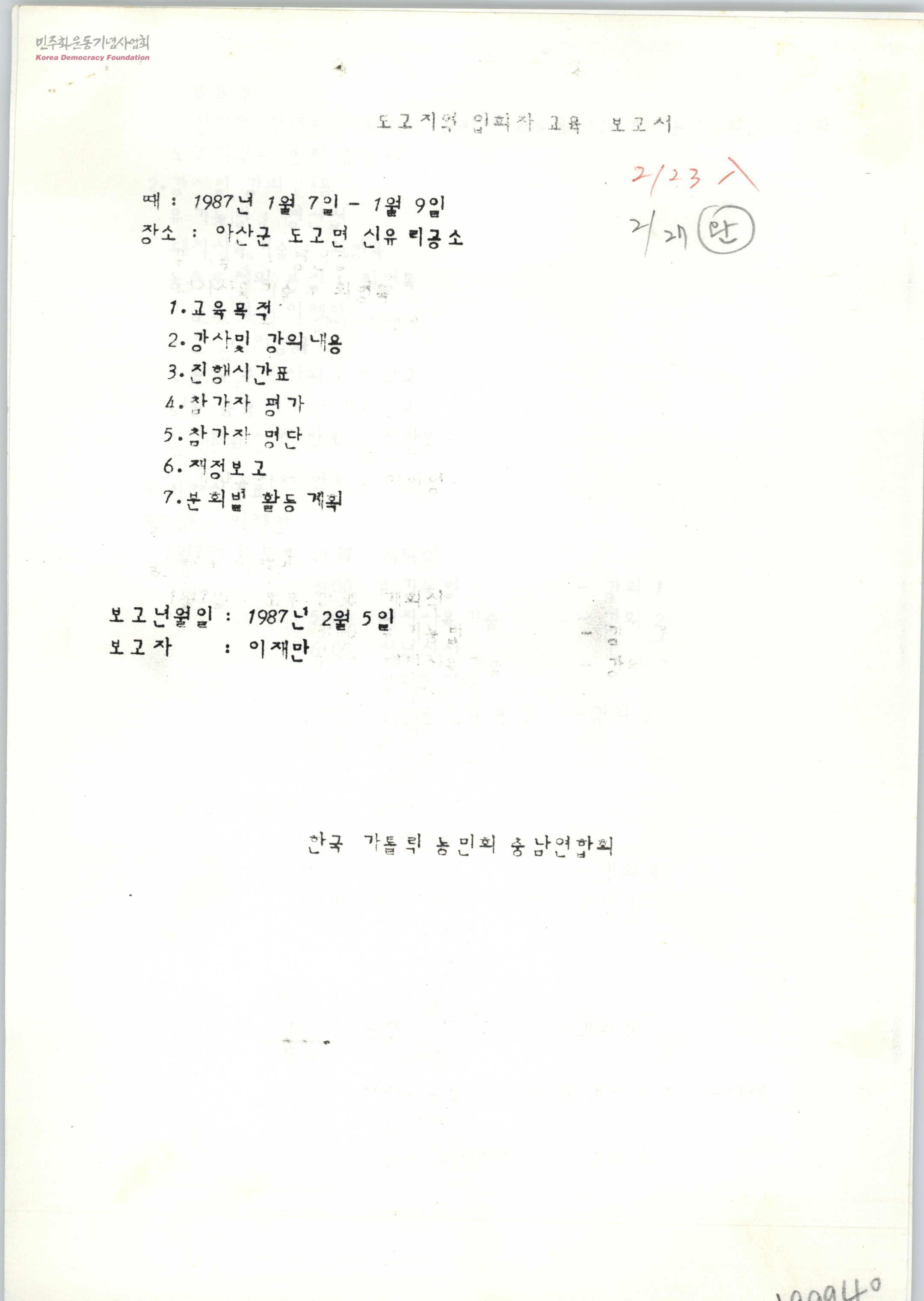 - 보고자:이재만 목차 1.교육목적 2.강사 및 강의내용 3.진행시간표 4.참가자 평가 5.참가자 명단 6.재정보고 첨부-1987사업계획