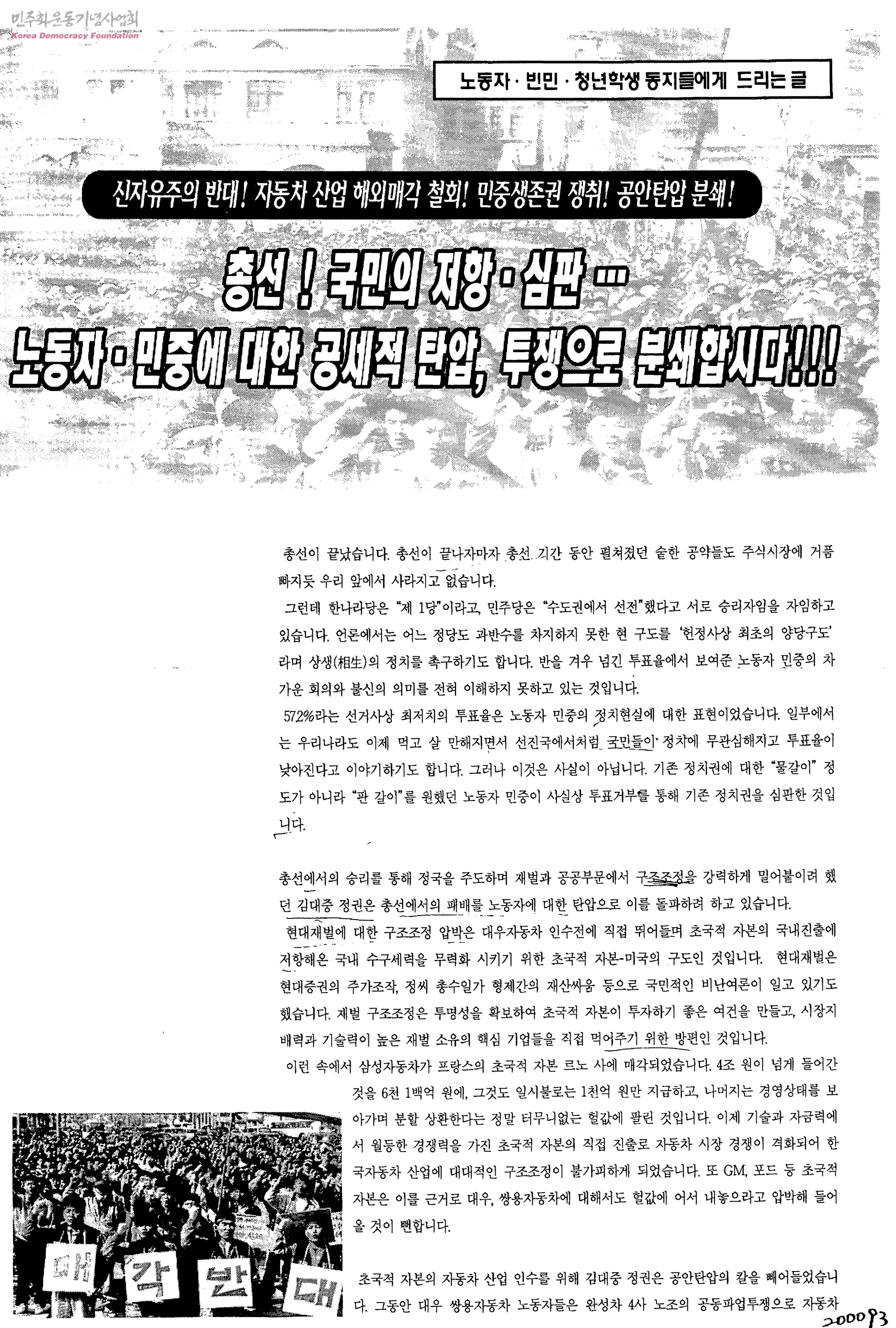 노동자 빈민 청년학생 동지들에게 드리는 글-총선 국민의 저항 심판 노동자·민중에 대한 공세적 탄압 투쟁으로 분쇄합시다
