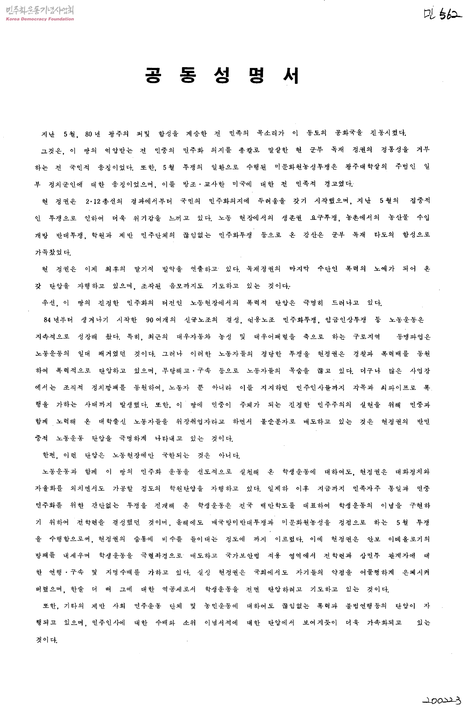 공동성명서-[민중민주운동 탄압하는 군부독재 물리치자]