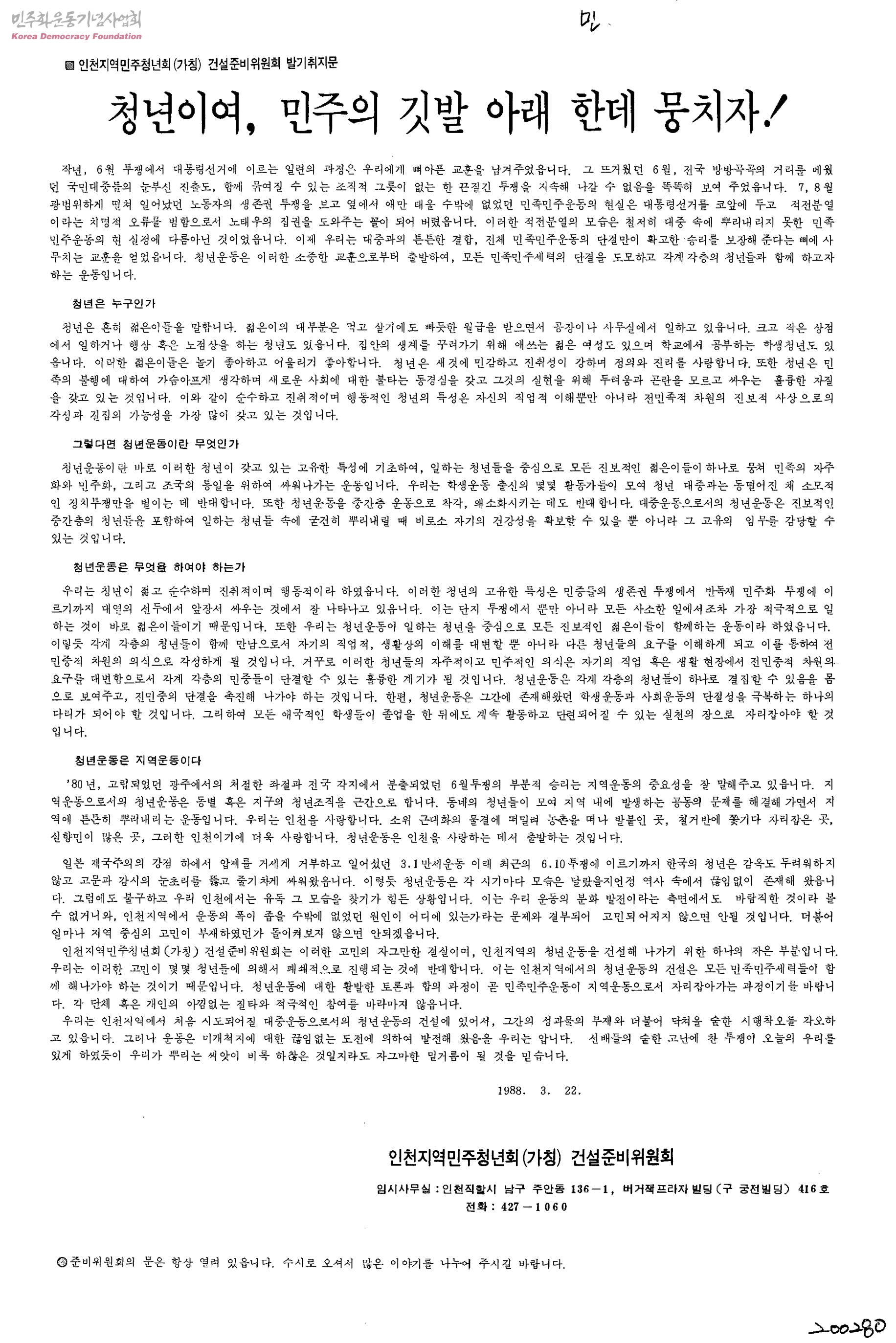 인천지역민주청년회(가칭) 건설준비위원회 발기취지문-청년이여, 민주의 깃발 아래 한데 뭉치자