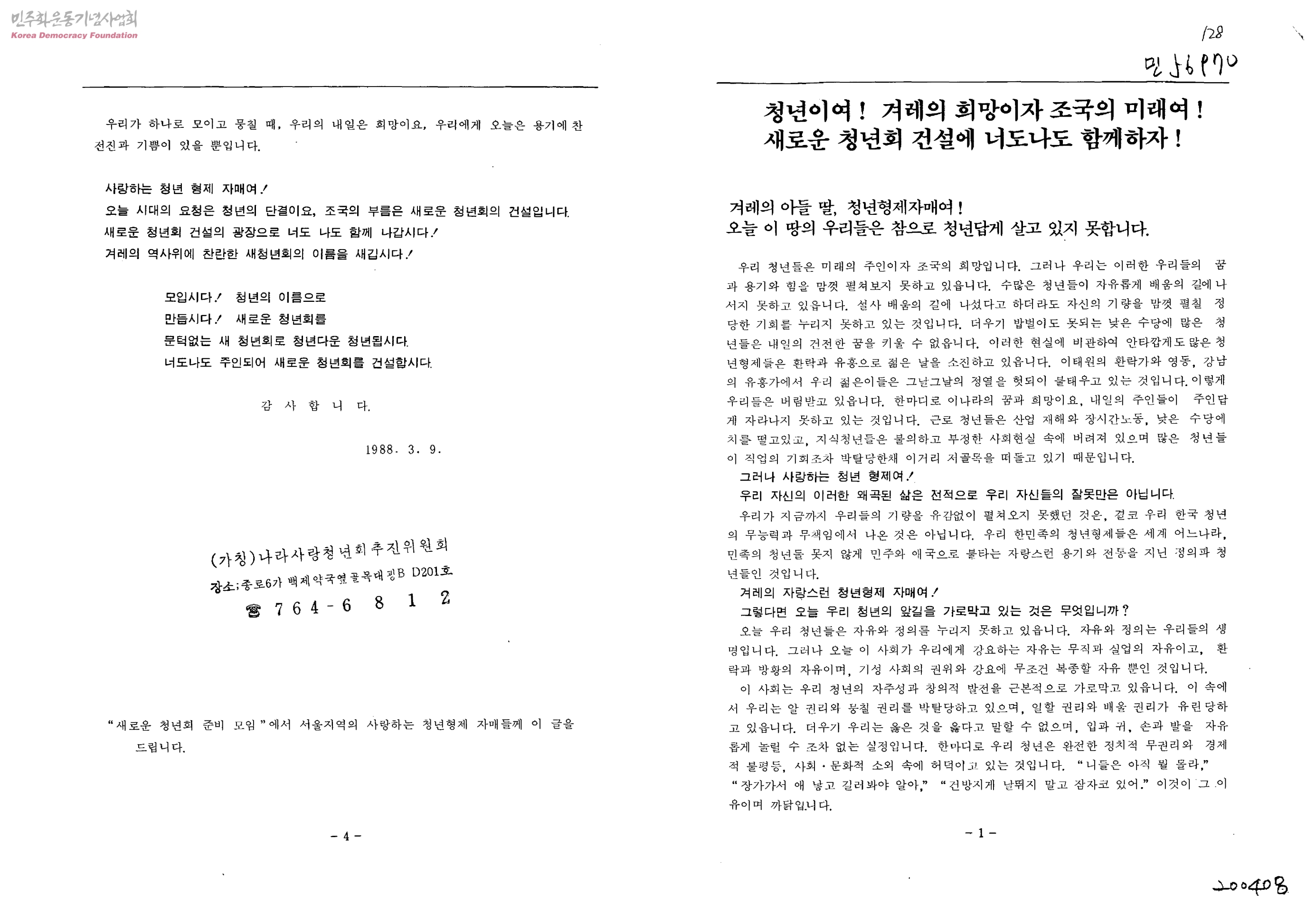 청년이여! 겨레의 희망이자 조국의 미래여! 새로운 청년회 건설에 너도나도 함께하자