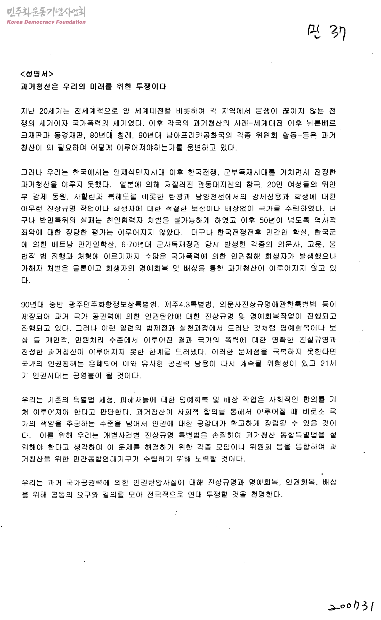 성명서-과거청산은 우리의 미래를 위한 투쟁이다