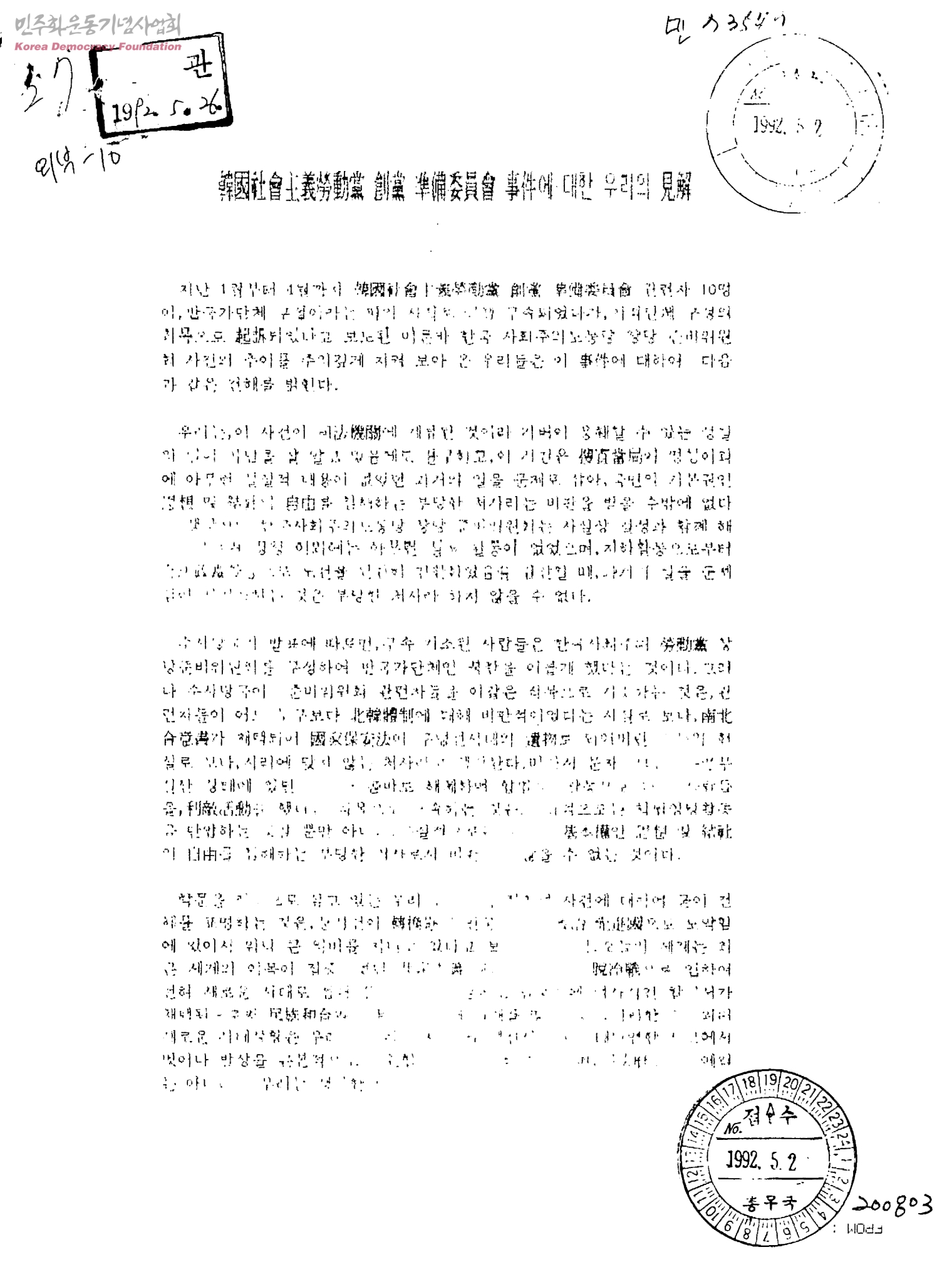 韓國社會主義勞動黨 創黨 準備委員會 事件에 대한 우리의 見解