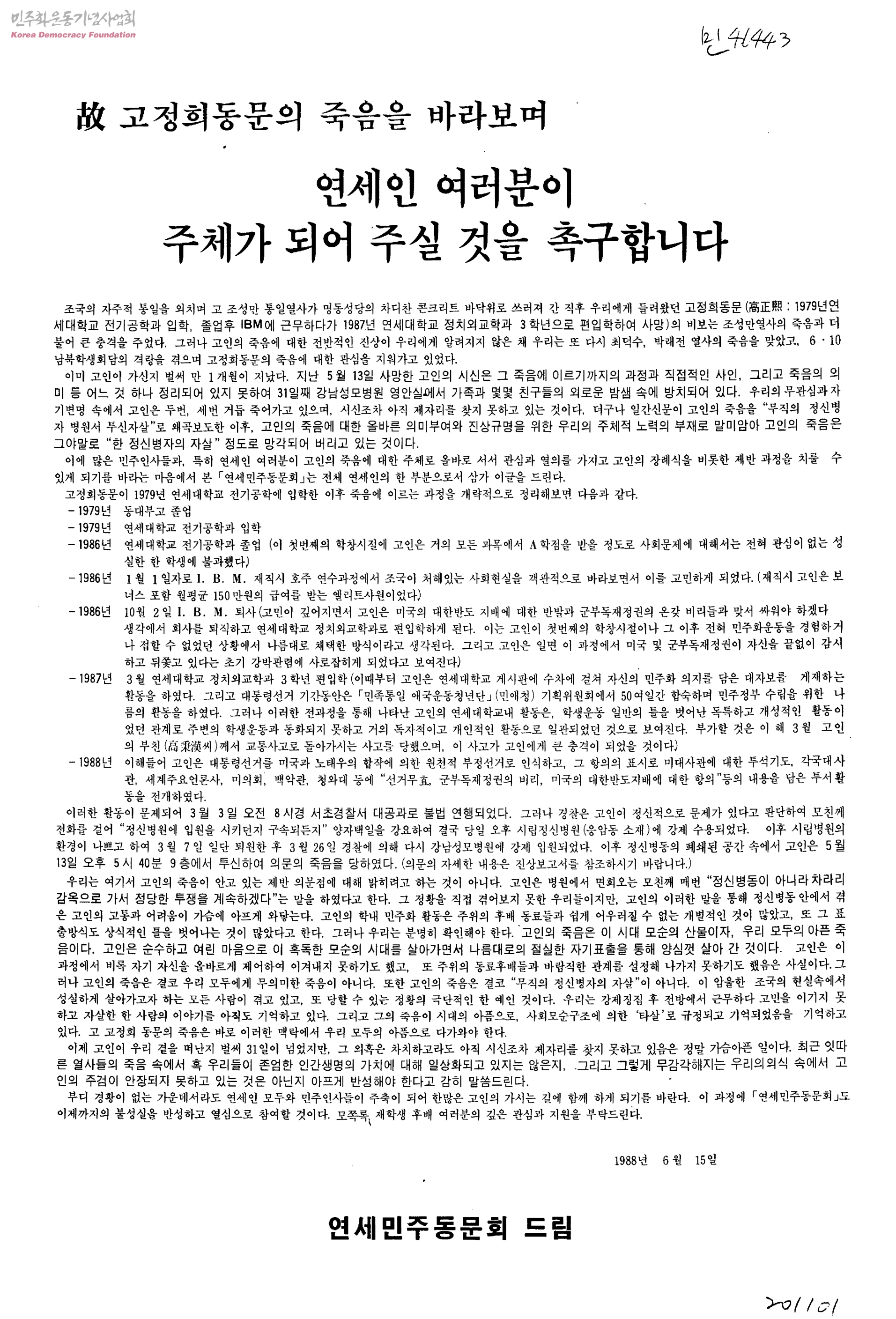 故 고정희동문의 죽음을 바라보며 연세인 여러분이 주체가 되어 주실 것을 촉구합니다