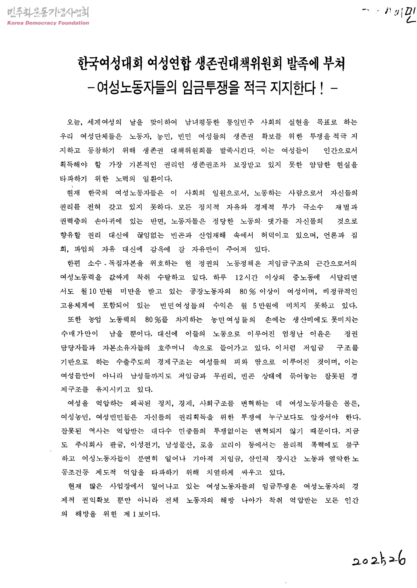 한국여성대회 여성연합 생존권대책위원회 발족에 부쳐- 여성노동자들의 임금투쟁을 적극 지지한다