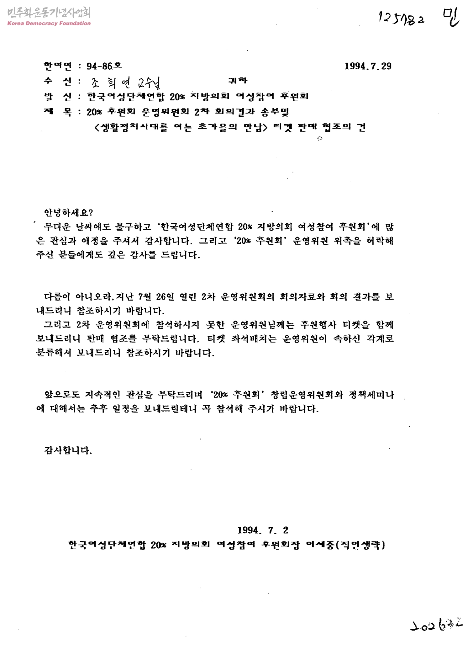 20%후원회 운영위원회 2차 회의결과 송부 및 <생활정치시대를 여는 초가을의 만남>티켓 판매 협조의 건[수신:조희연 교수님, 발신:한국여성단체연합20%지방의회여성참여후원회]