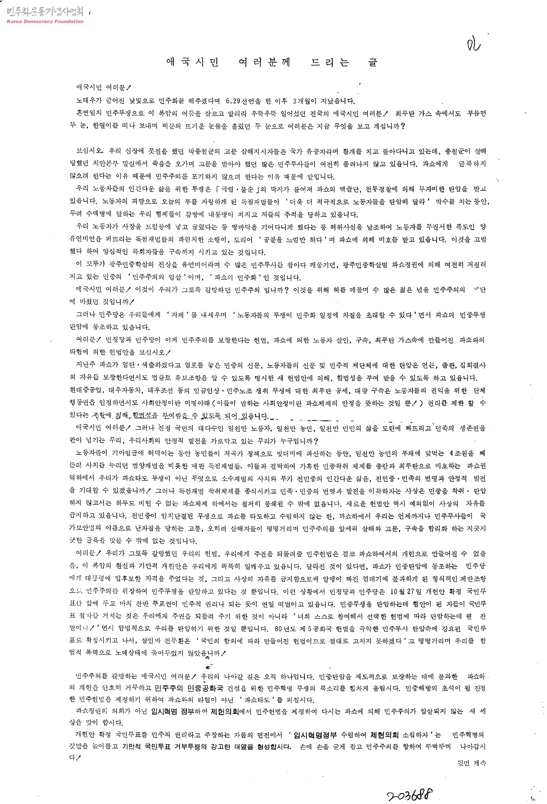 애국시민 여러분께 드리는 글[노태우가 굳어진 눈빛으로 민주화를 해주겠다며 6.29선언을 한 이후 3개월이 지났읍니다]