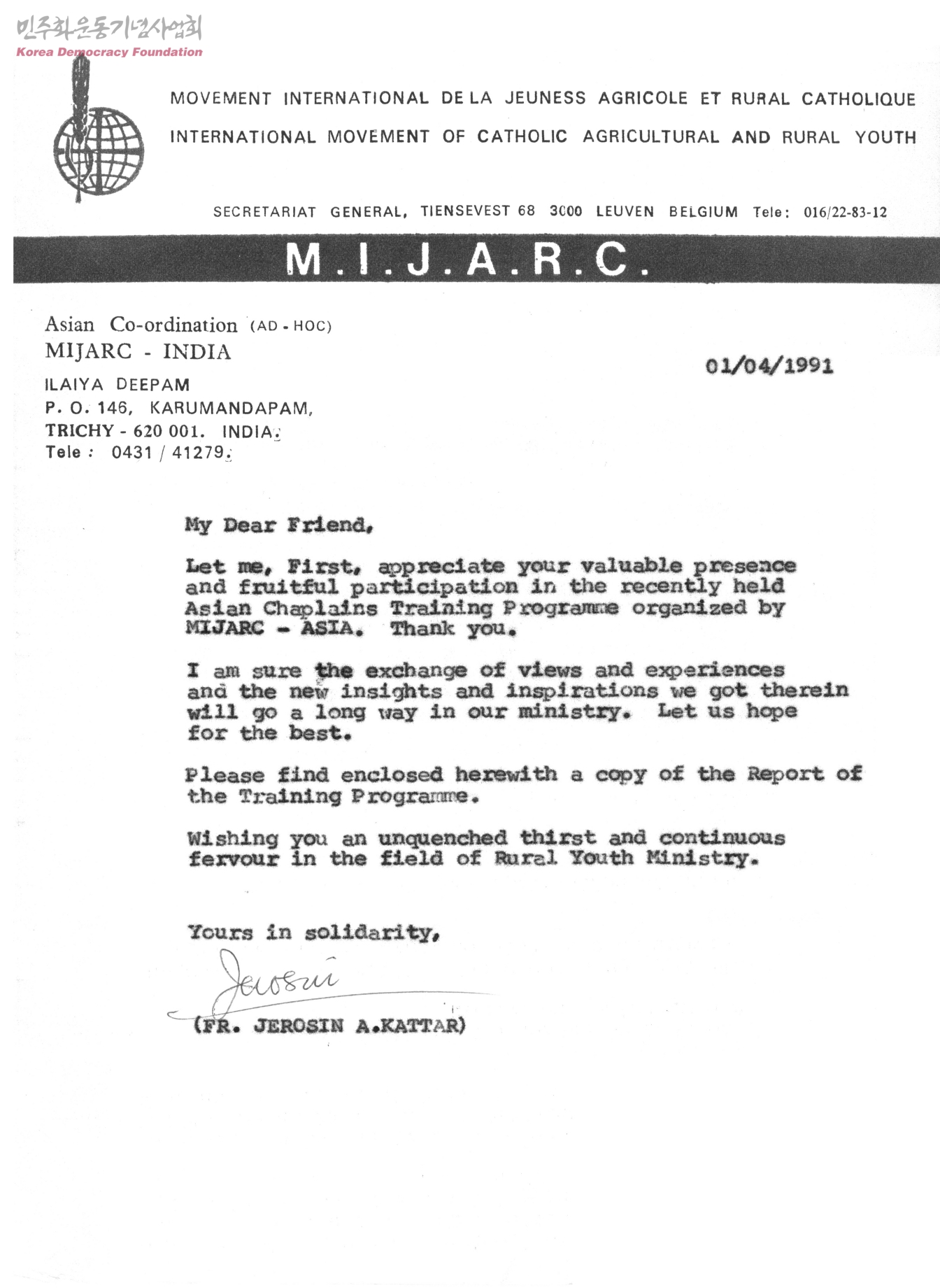 [Fr. Jerosin이 MIJARC-INDIA에 보내는 공문]