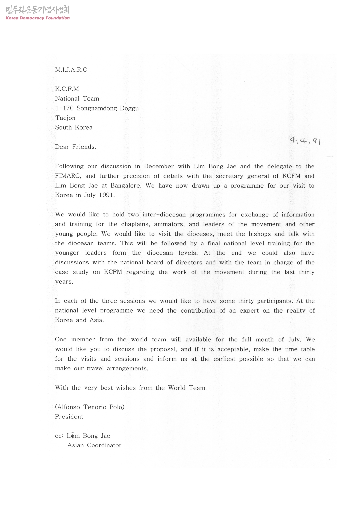 [MIJARC회장 Alfonso가 가농의 임봉재에게 보내는 MIJARC 제안글]