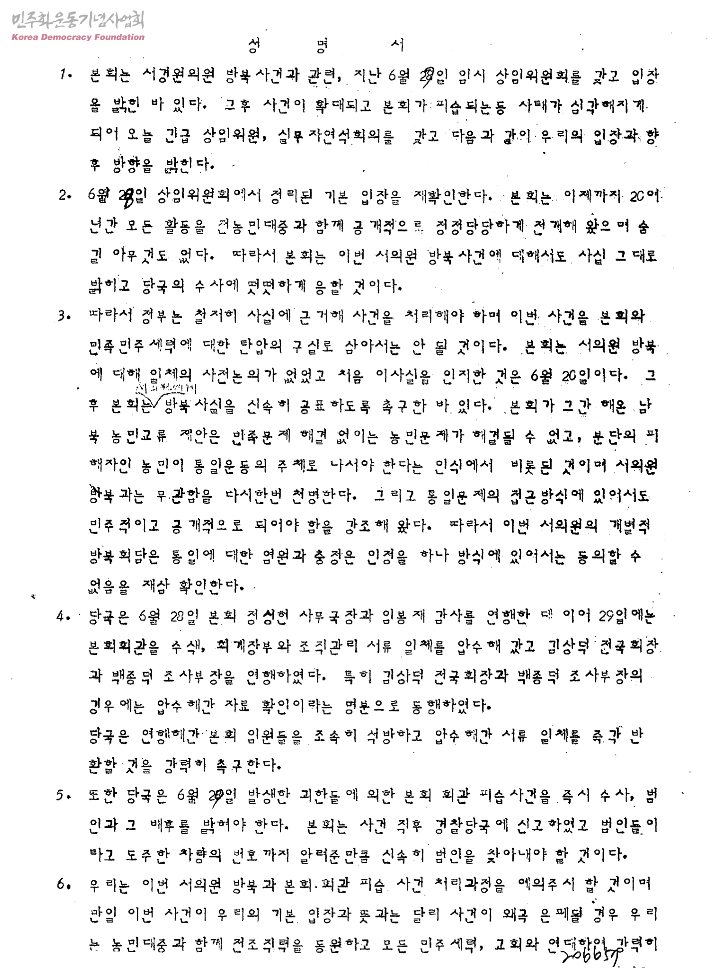 - 생산자 및 기증자가 ‘박용수’인 사진의 사용은 구매신청을 클릭하여 직접 사진 구매 신청을 하실 수 있습니다. 생산자 및 기증자가 ‘경향신문사’인 사진의 사용은 경향신문사 담당자(02-3701-1635)를 통해 구매하실 수 있습니다. 그 외의 생산자 및 기증자는 민주화운동기념사업회 사료관 담당자( hyunchaek@kdemo.or.kr / 02-6440-8961 )에 문의바랍니다.