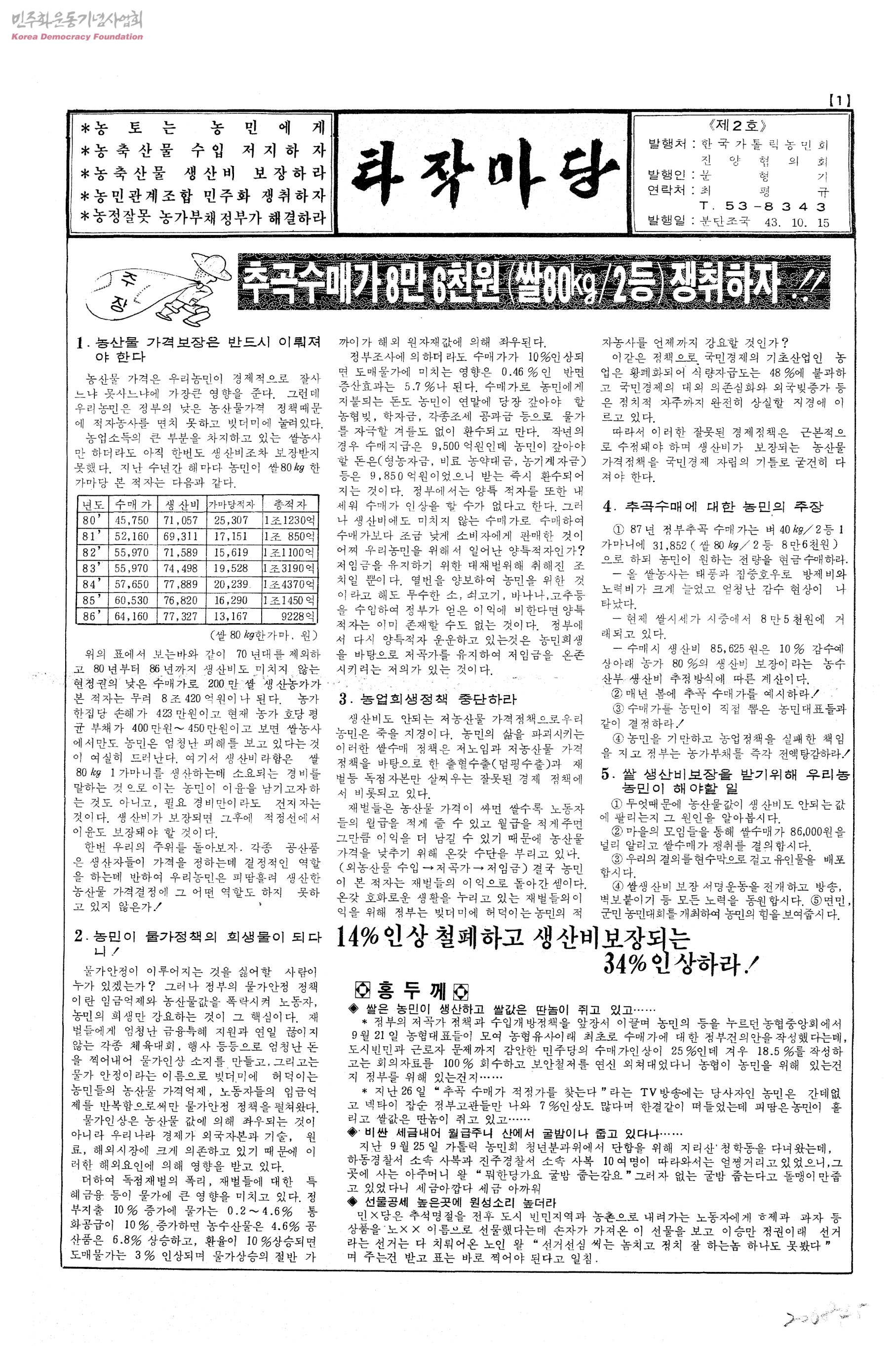 - -추곡수매가 8만 6천원 쟁취하자!! -언론의 자유는 농민생존권 쟁취의 첫걸음 -농축산물 수입저지하여 농민생존권 쟁취하자
