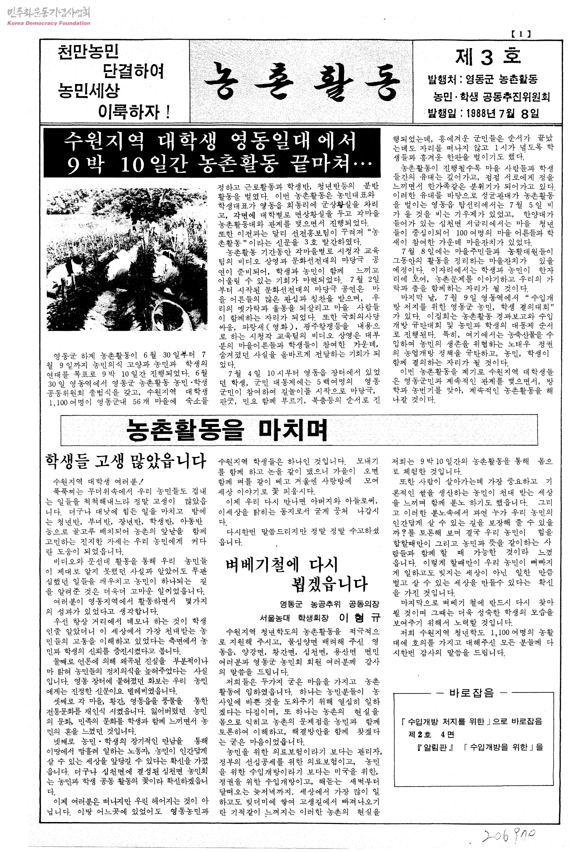 - 수원지역 대학생 영동일대에서 9박10일간 농촌활동 끝마쳐... 기획;농민운동이란? 학교교육의 실정 사설:광주학살은 비인간적 반민족적 범행