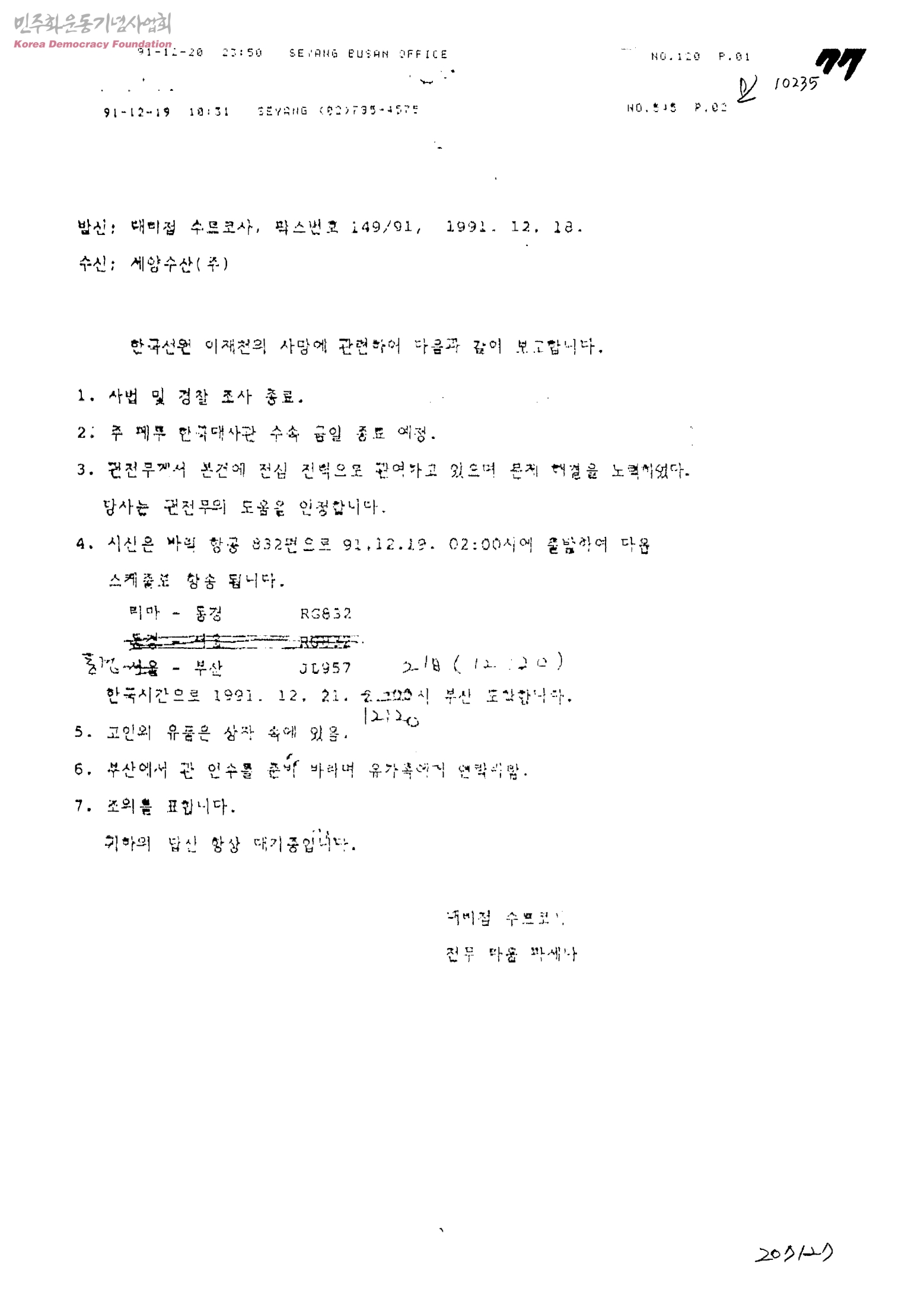 한국선원 이재천의 사망에 관하여 다음과 같이 보고합니다[수신:세양수산(주)]