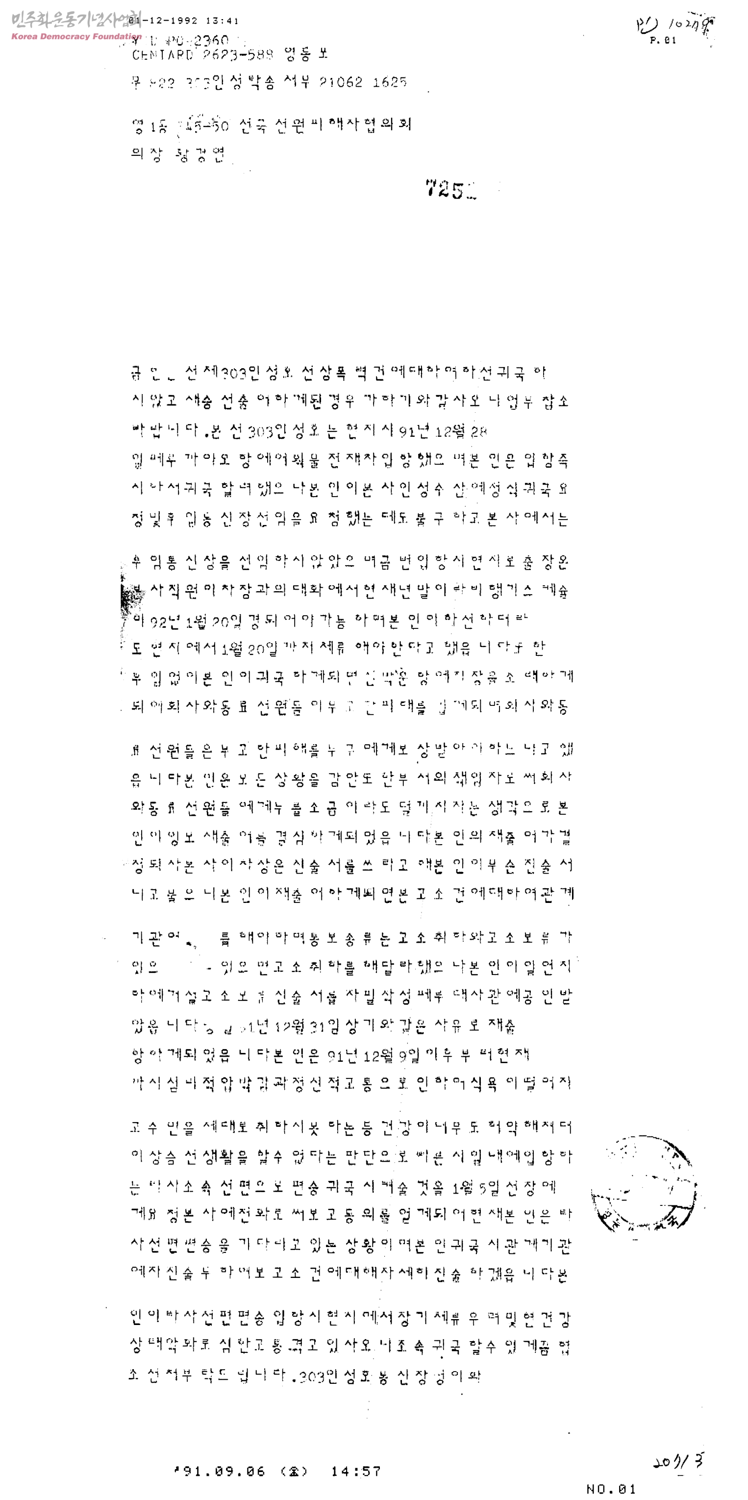 [인성호 선장의 폭력행위에 관한 팩스문서]