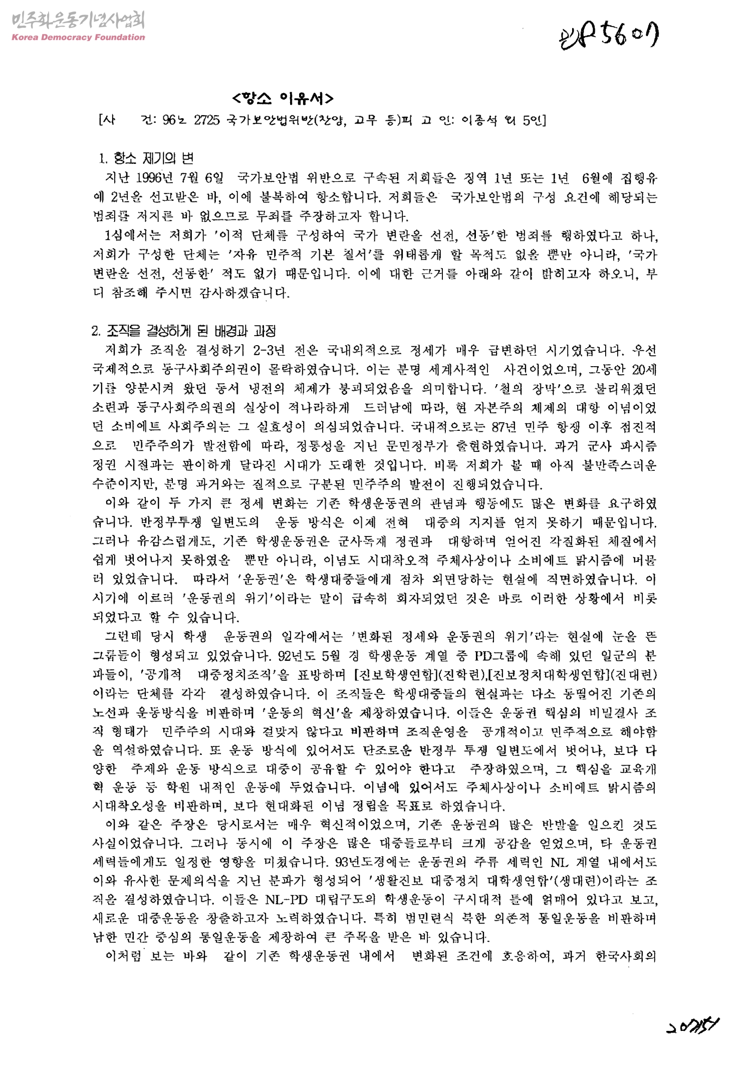 항소이유서[국가보안법위반 혐의로 구속된 것에 관한 건]