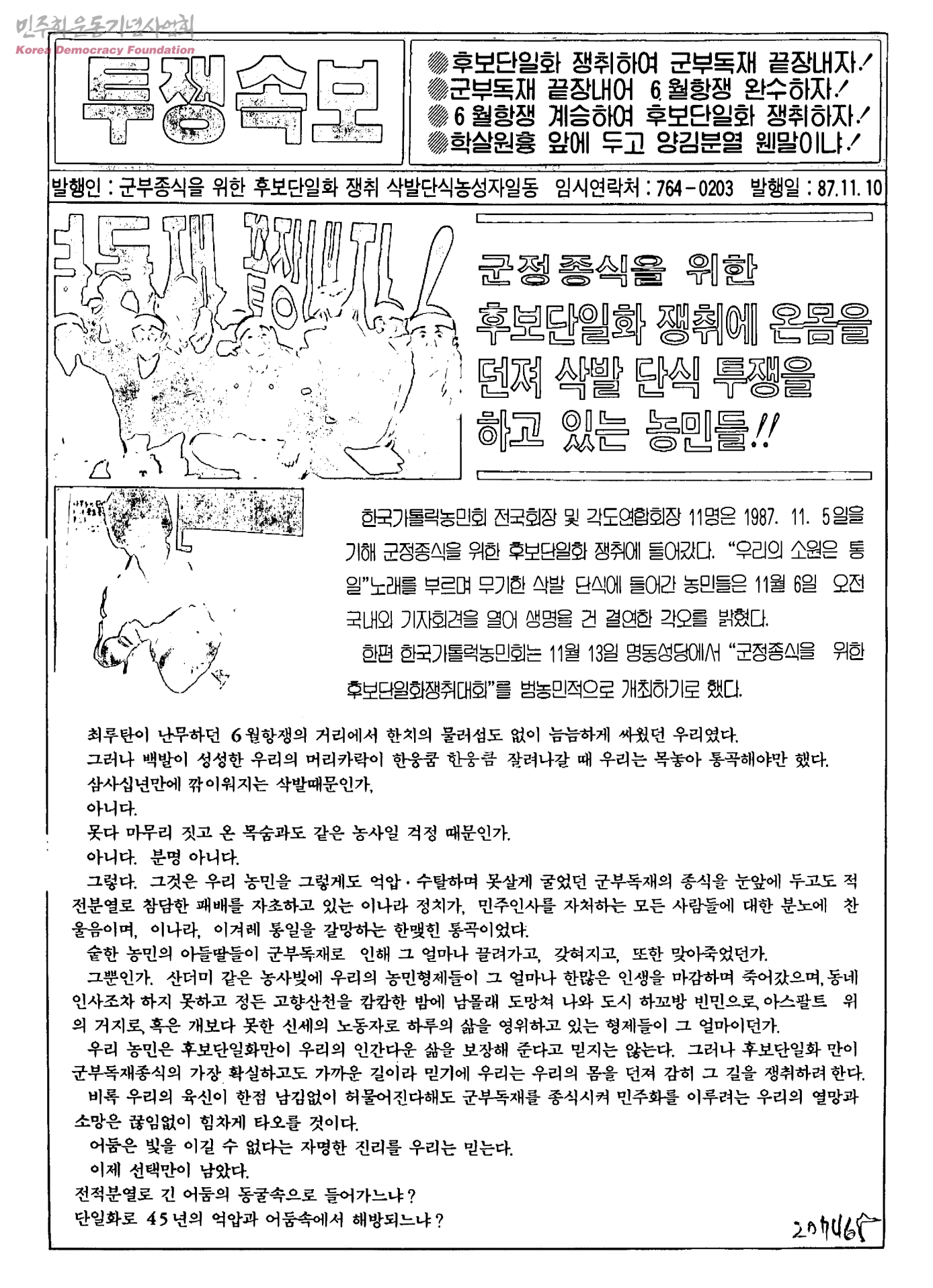 투쟁속보-군정종식을 위한 후보단일화 쟁취에 온몸을 던져 삭발 단식 투쟁을 하고 있는 농민들!