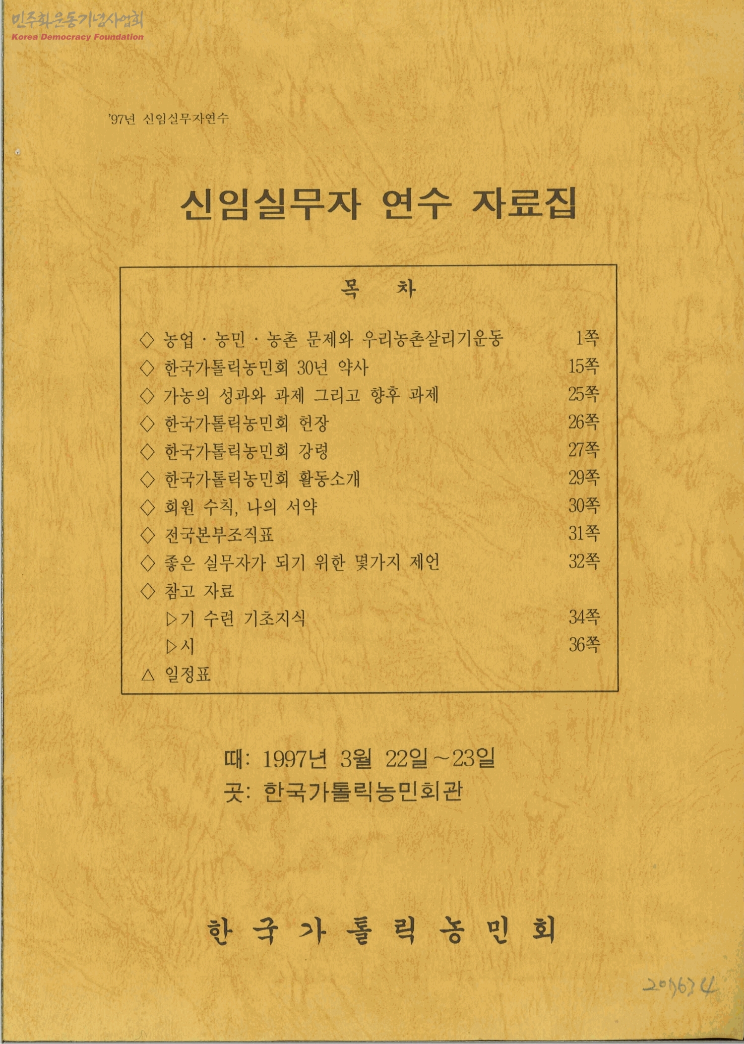 - - 농업·농민·농촌 문제와 우리농촌살리기운동 - 한국가톨릭농민회 30년 약사 - 가농의 성과와 과제 그리고 향후 과제 - 한국가톨릭농민회 헌장 - 한국가톨릭농민회강령 - 한국가톨릭농민회 활동소개 - 회원수칙, 나의 서약 - 전국본부조직표 - 좋은 실무자가 되기 위한 몇가지 제언 - 참고자료: 기 수련 기초지식 - 일정표