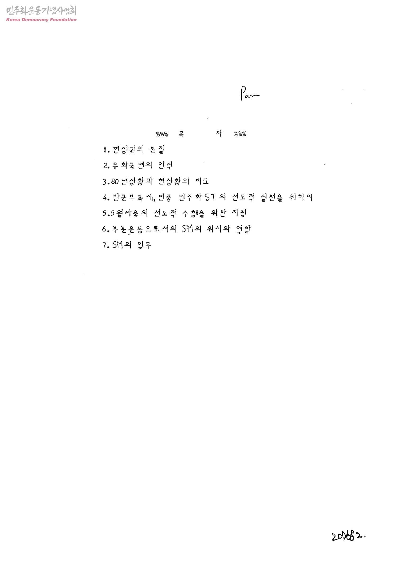 - 1. 현정권의 본질 2. 유화국면의 인식 3. 80년상황과 현상황의 비교 4. 반군부독재, 민중 민주화ST의 선도적 실천을 위하여 5. 5월싸움의 선도적 수행을 위한 지침 6. 부분운동으로서의 SM의 위치와 역할 7. SM의 임무