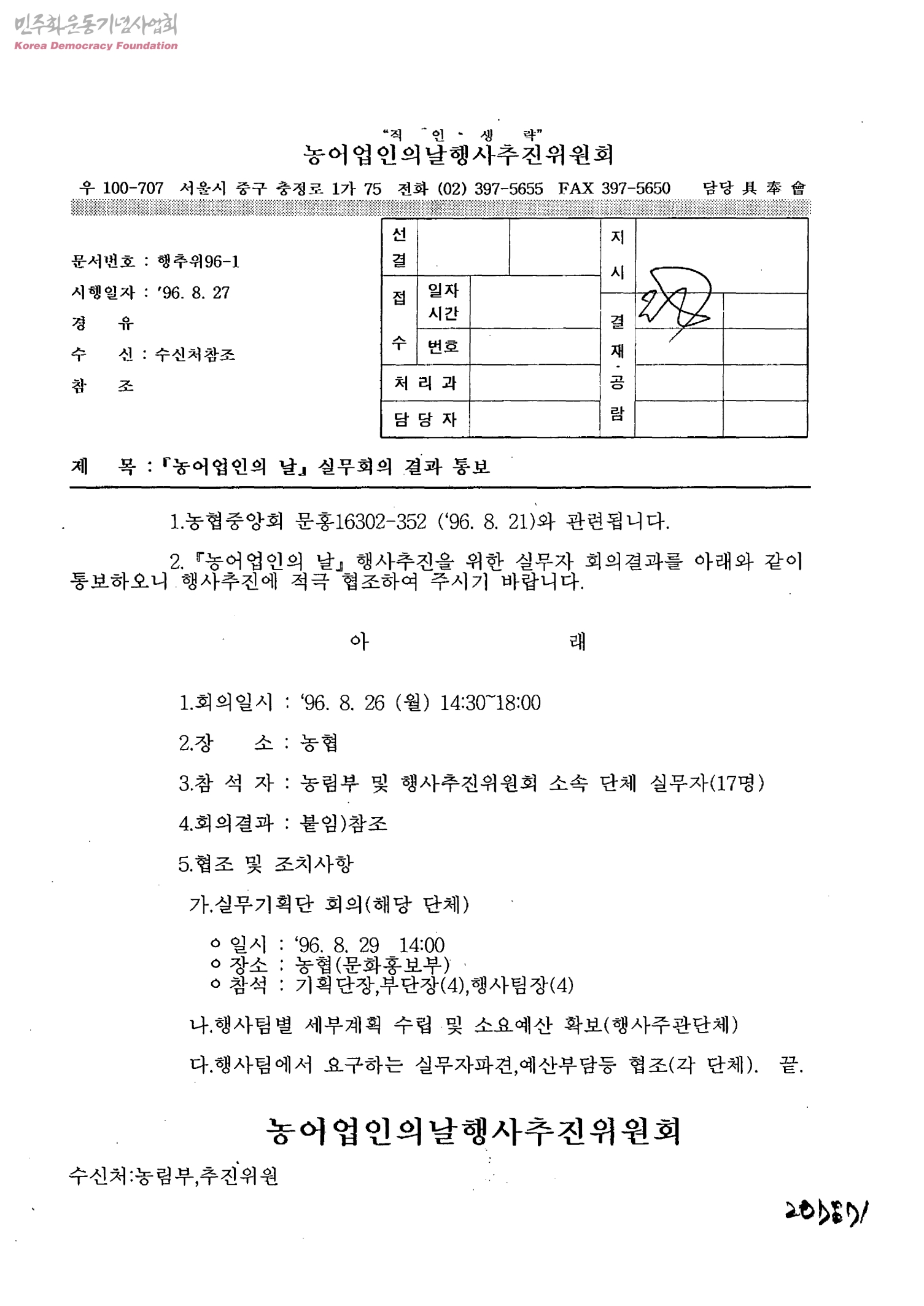 농어업인의 날 실무회의 결과 통보[수신:농림부, 추진위원, 발신:농어업인의날 행사추진위원회]
