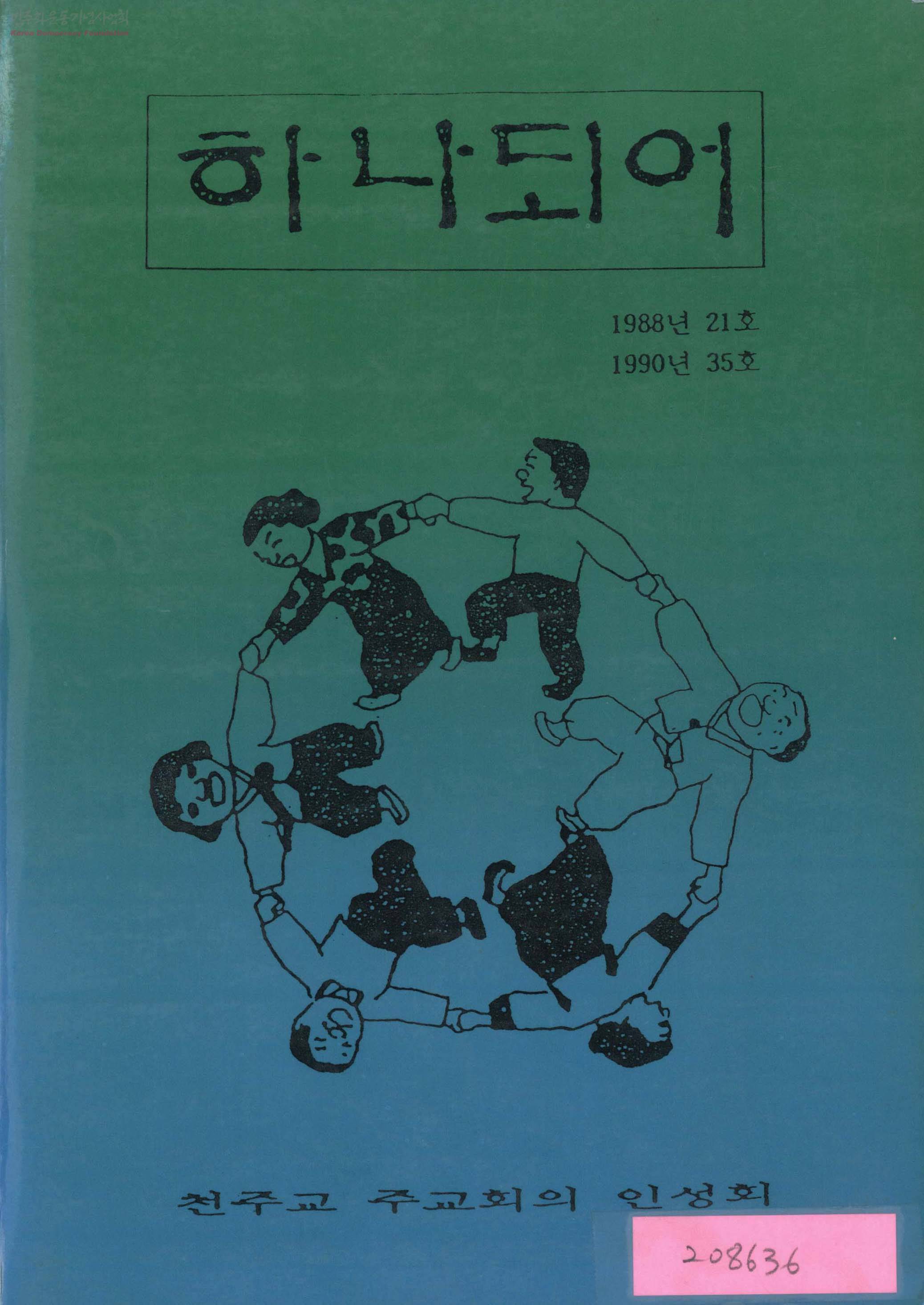 - *80-90년대 비 민주적인 방식으로 농가와 농민의 희생을 담보삼아 수출, 중공업 위주의 정책을 피고, 외국 농축산물을 무분별하게 수입하는 정부를 비판하며 농민과 농가를 위한 정책 수립과 이 과정에서 농민이 주도하는 민주화로 시급히 이행해야함을 촉구하는데 있어 구심점이 되었던 천주교단의 소식지. 하나되어 제21호(1988. 10)~35호(1990. 1)