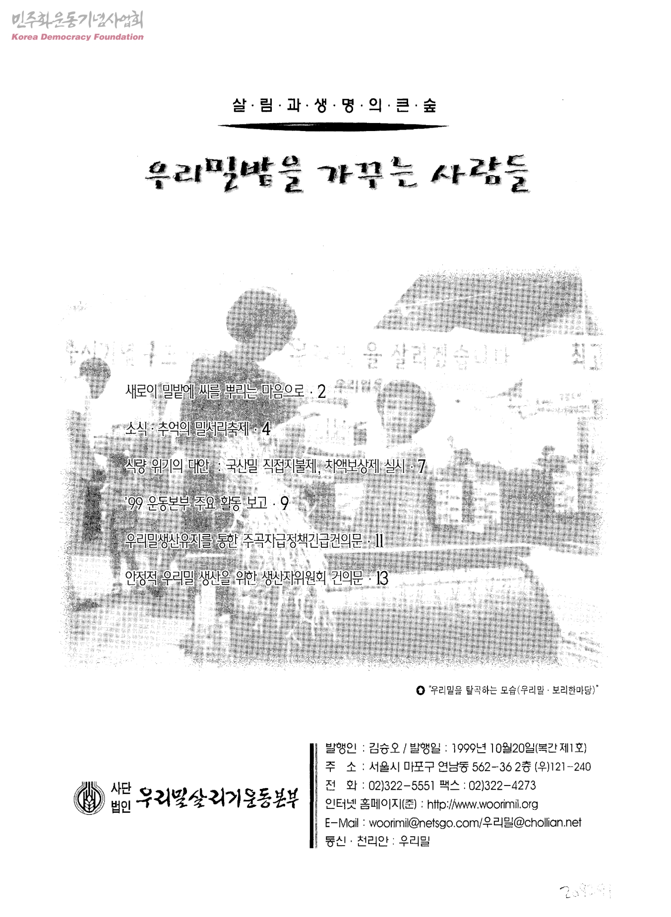 - 1.새로이 밀밭에 씨를 뿌리는 마음으로 2.소식·추억의 밀서리축제 3.식량위기의 대안: 국산밀 직접지불제, 차액보상제 실시 4.99운동본부 주요 활동보고 5.우리밀생산유지를 통한 주곡자급정책긴급건의문 6.안정적 우리밀 생산을 위한 생산자위원회 건의문