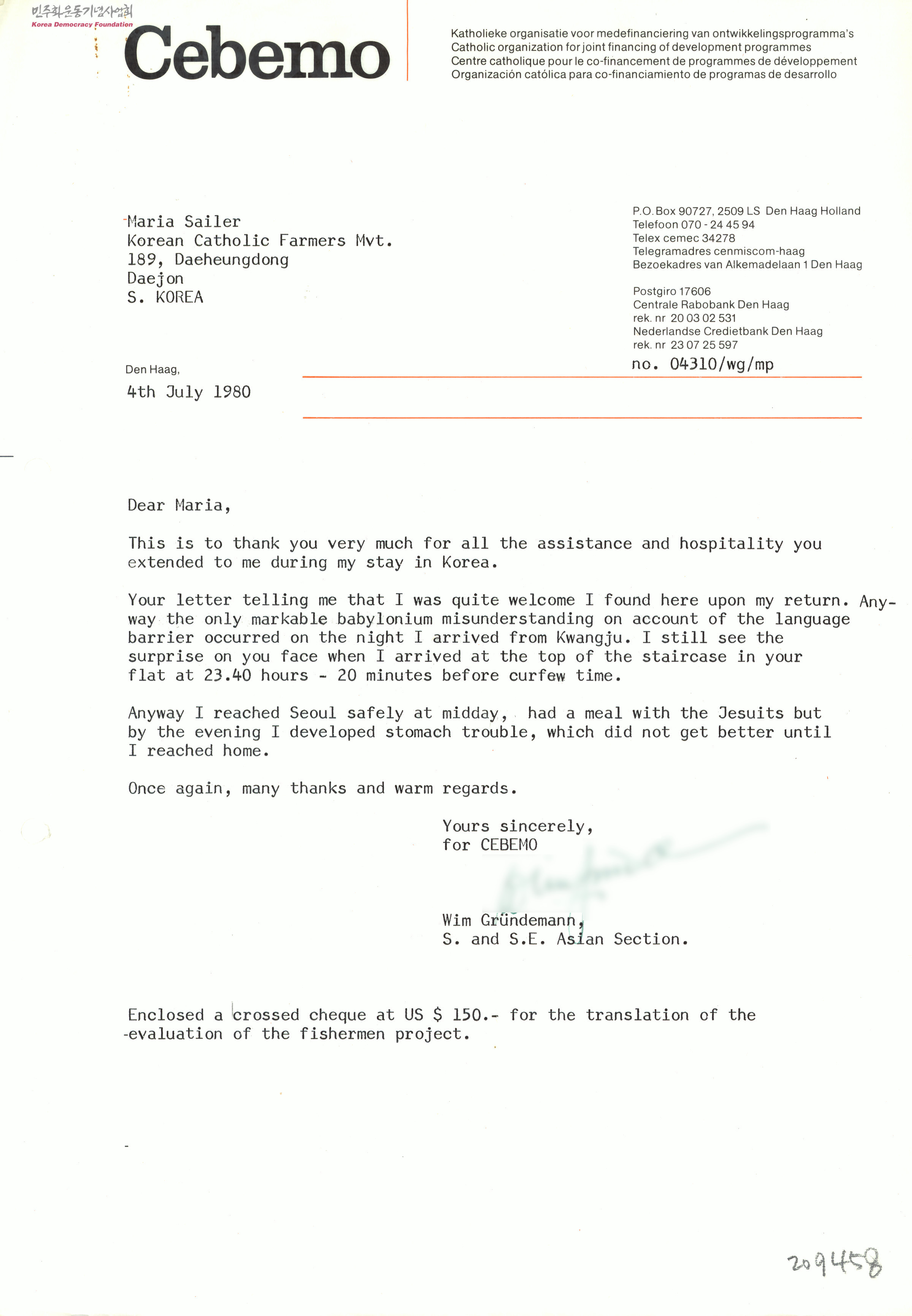 [Cebemo의 Wim Gruendemann이 한국가톨릭농민회 Maria Sailer에 보내는 방한시의 지원과 호의에 대한 감사 편지]