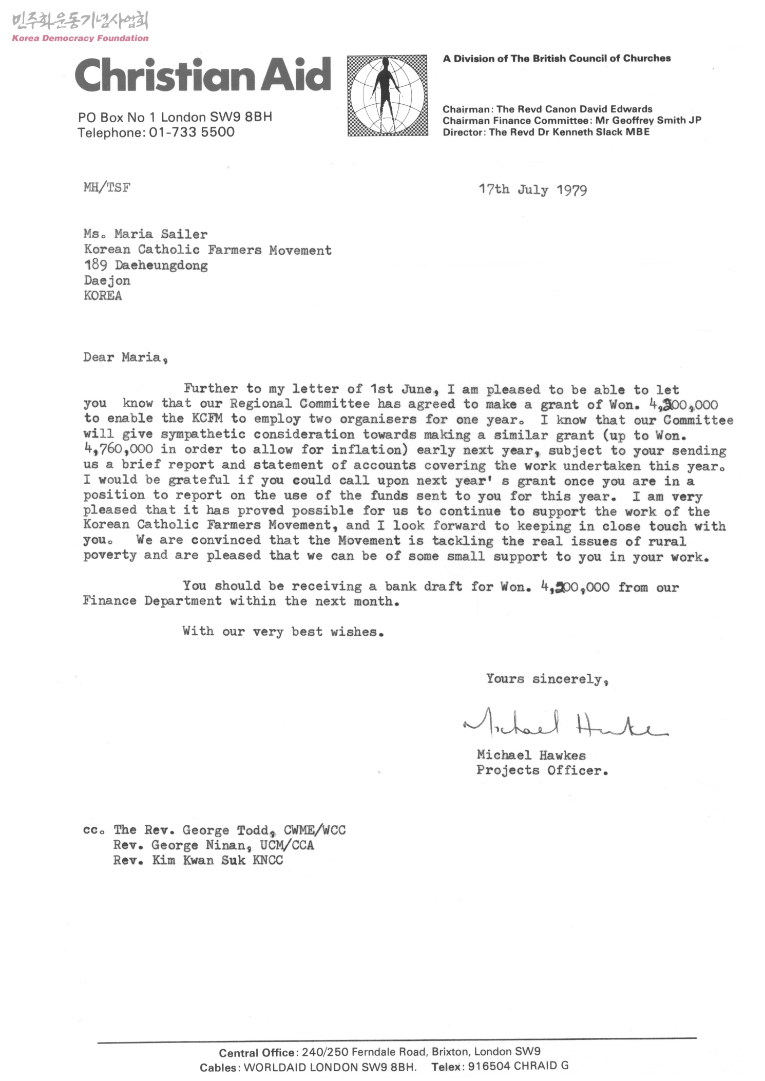 [Christian Aid의 Michael Hawkes가 한국가톨릭농민회 Maria Sailer에 보내는 지원 안내 편지]