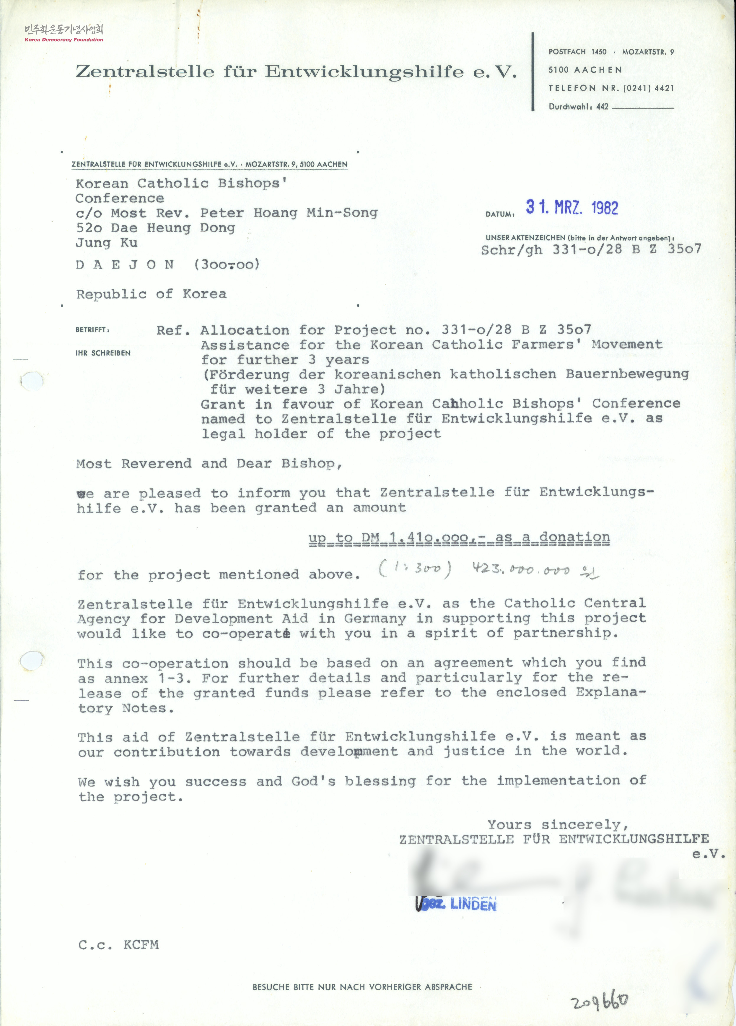 [Zentralstelle fur Entwicklungshilfe e.V가 한국가톨릭농민회에 보내는 자금지원 결정에 대한 수발신문서]