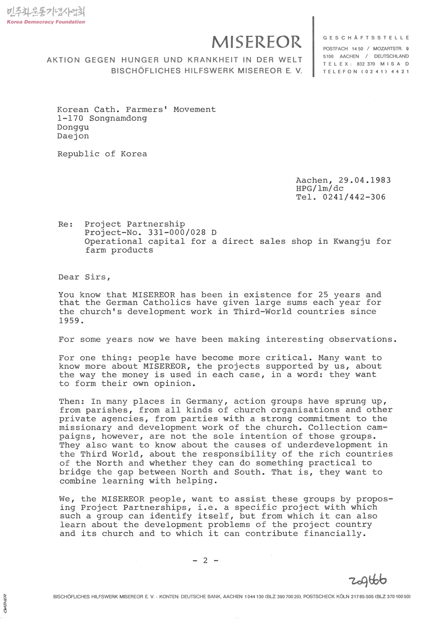 [MISEREOR의 K.Kronenberg와 H.P.Gohla가 한국가톨릭농민회에 보내는 Project Partnership 제안에 대한 수발신문서]
