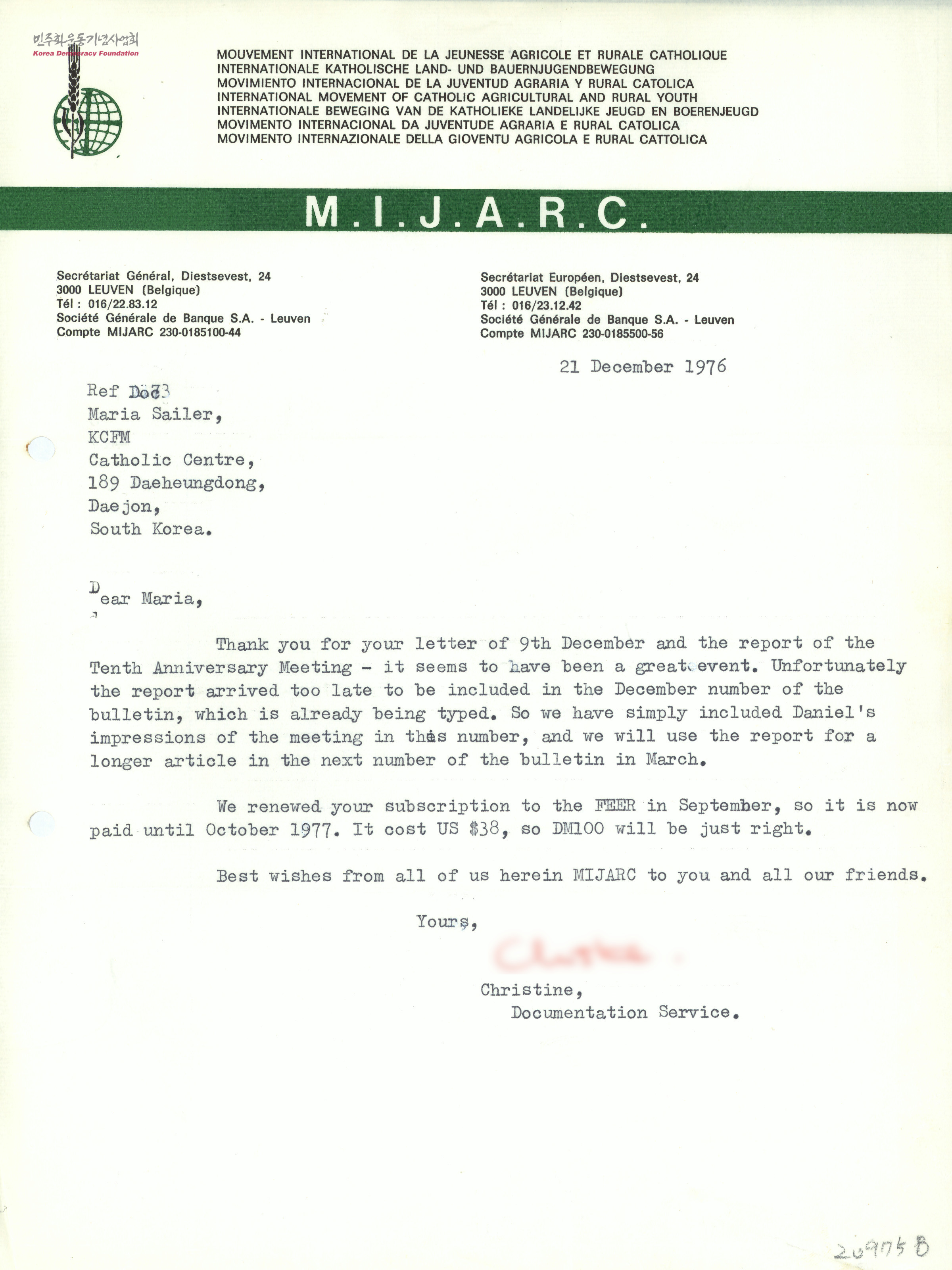 [MIJARC의 Christine이 한국가톨릭농민회의 Maria Sailer에 보내는 보고서제출에 대한 감사 편지]