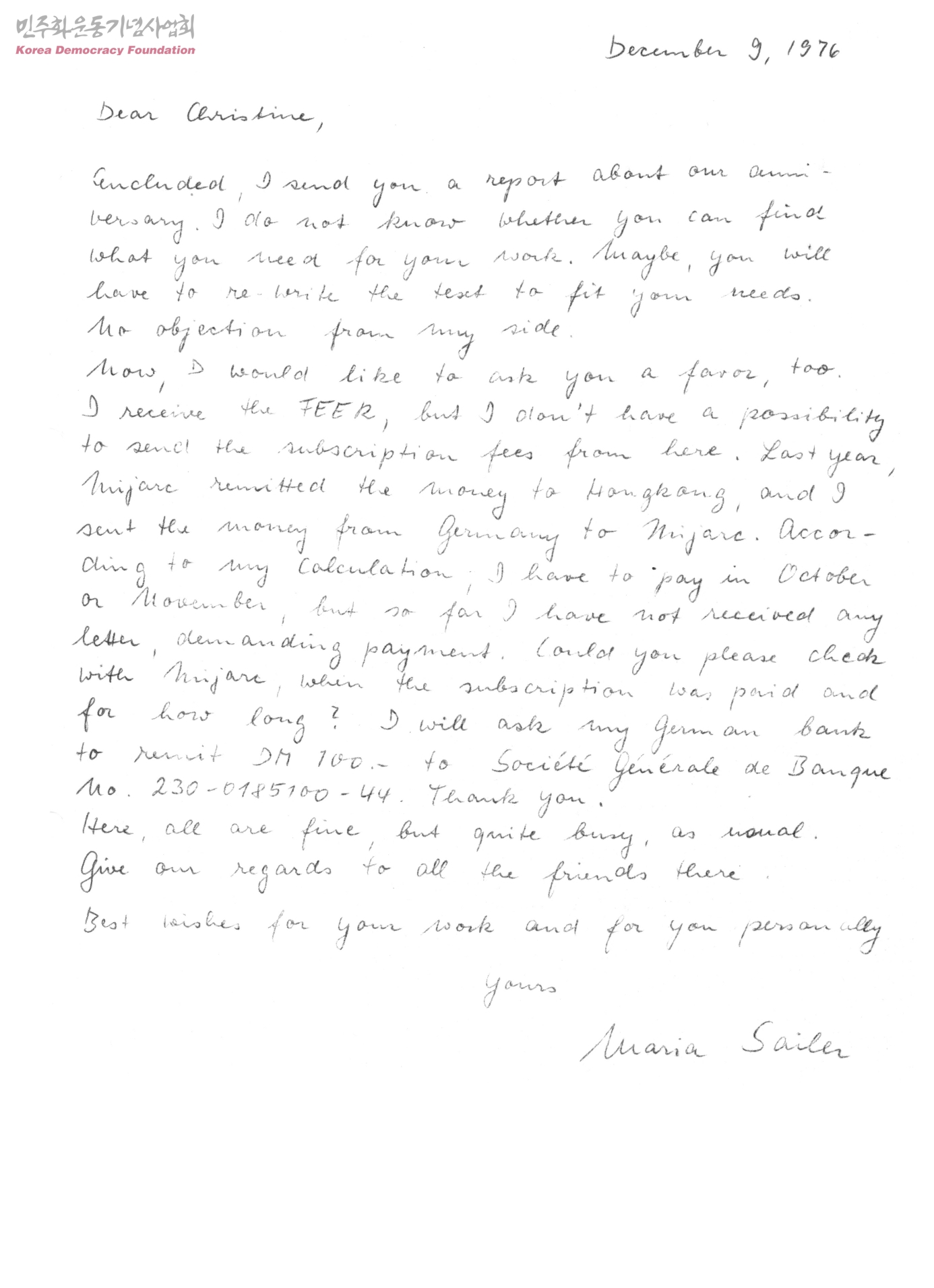 [한국가톨릭농민회의 Maria Sailer가 MIJARC의 Christine에 보내는 보고서에 관한 수발신문서]