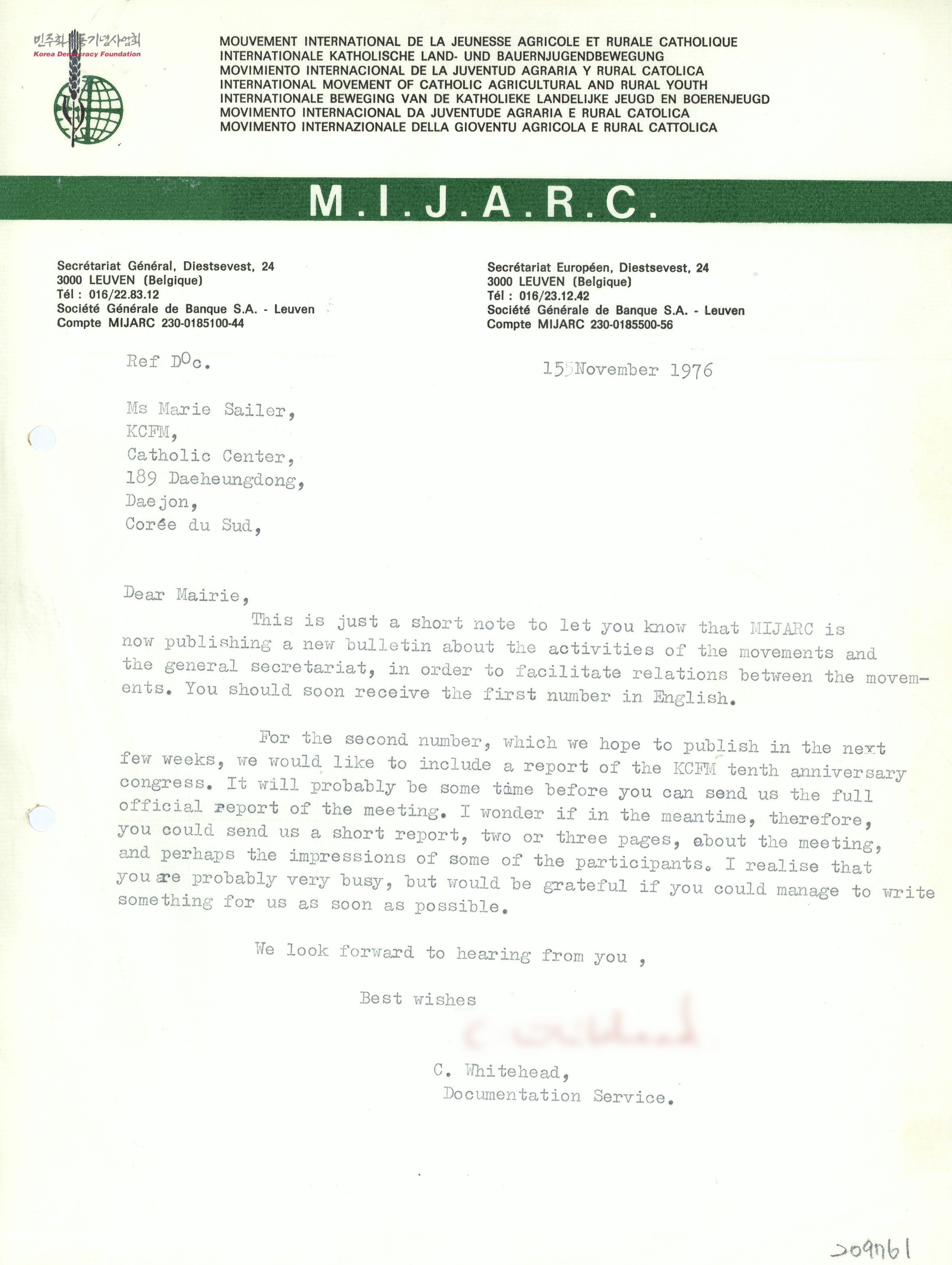 [MIJARC의 C.Whatehead가 한국가톨릭농민회의 Maria Sailer에게 보내는 회보에 기재될 보고서 제출 요청편지]